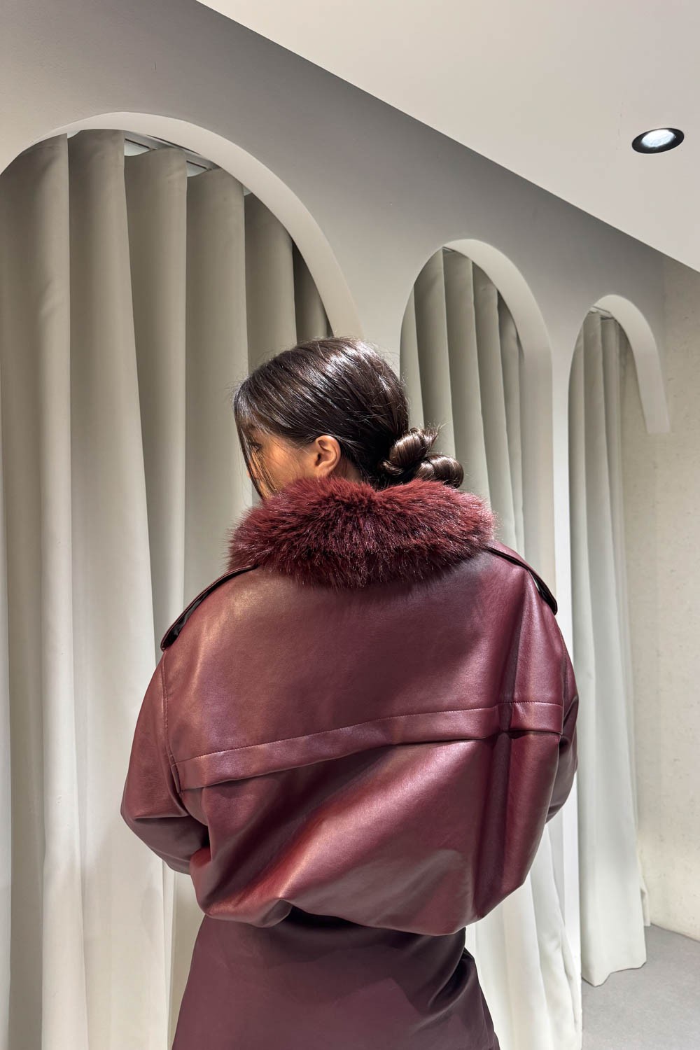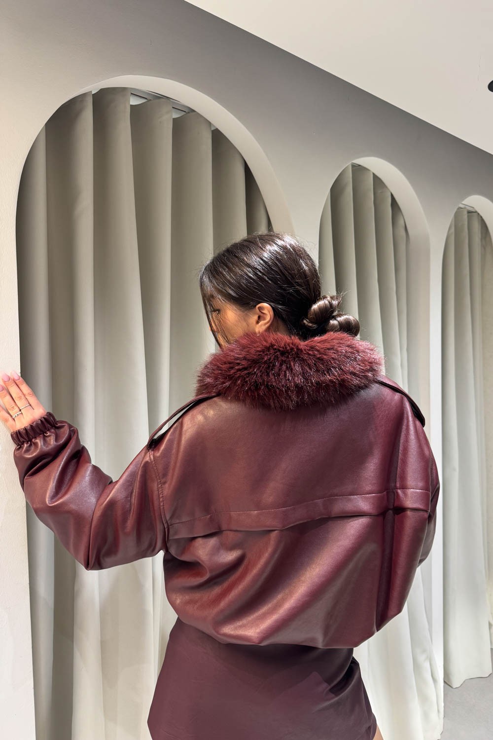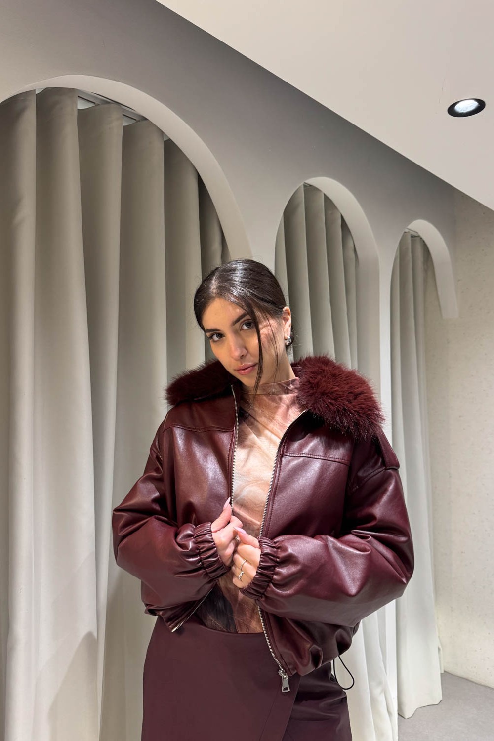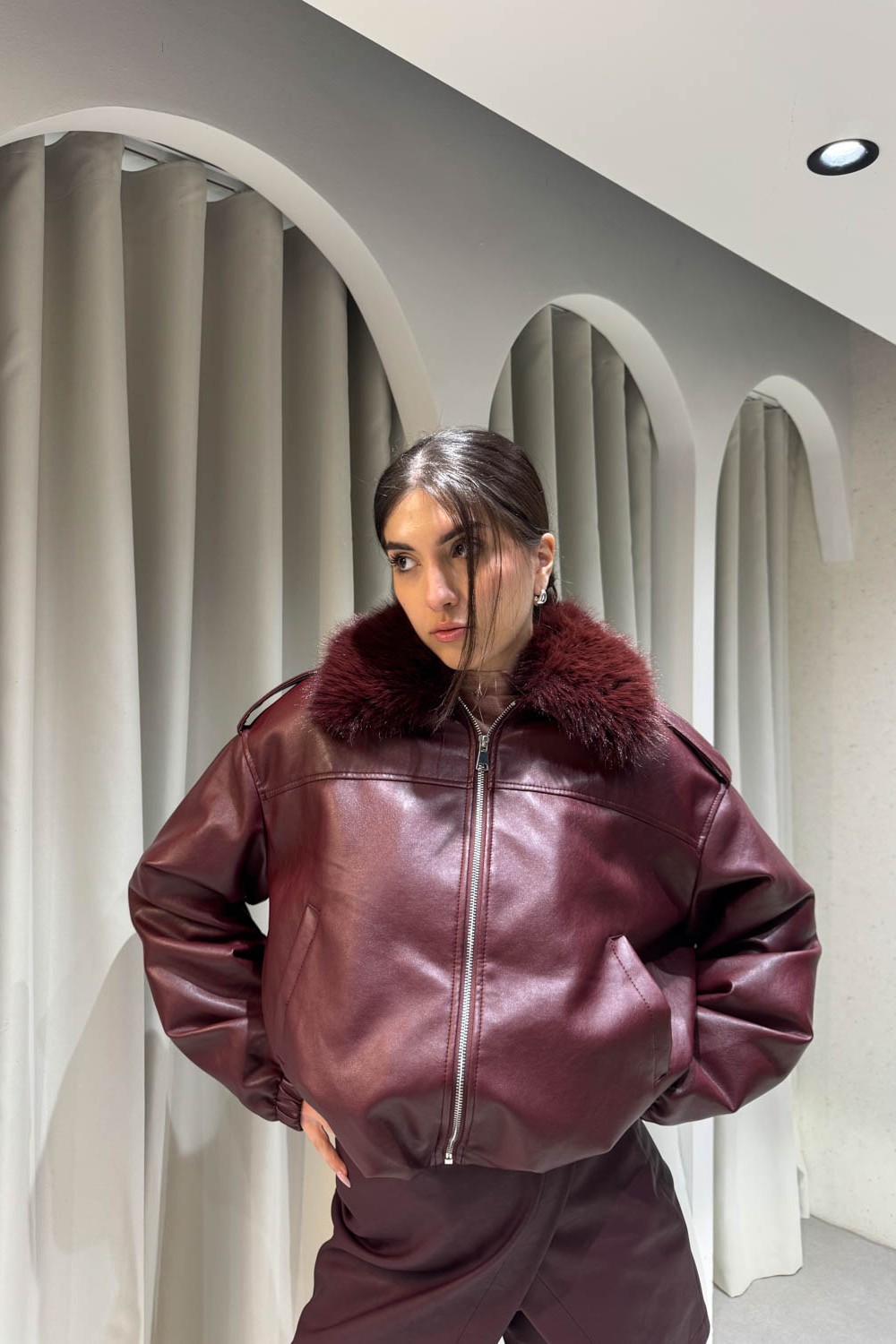 Μπουφάν bomber δερματίνη με γουνάκι στον γιακά , περιέχει λάστιχο στην μέση και στο τελείωμα των μανικιών , δύο τσέπες , εσωτερική γούνα και κλείνει στο μπροστινό μέρος με φερμουάρ.
