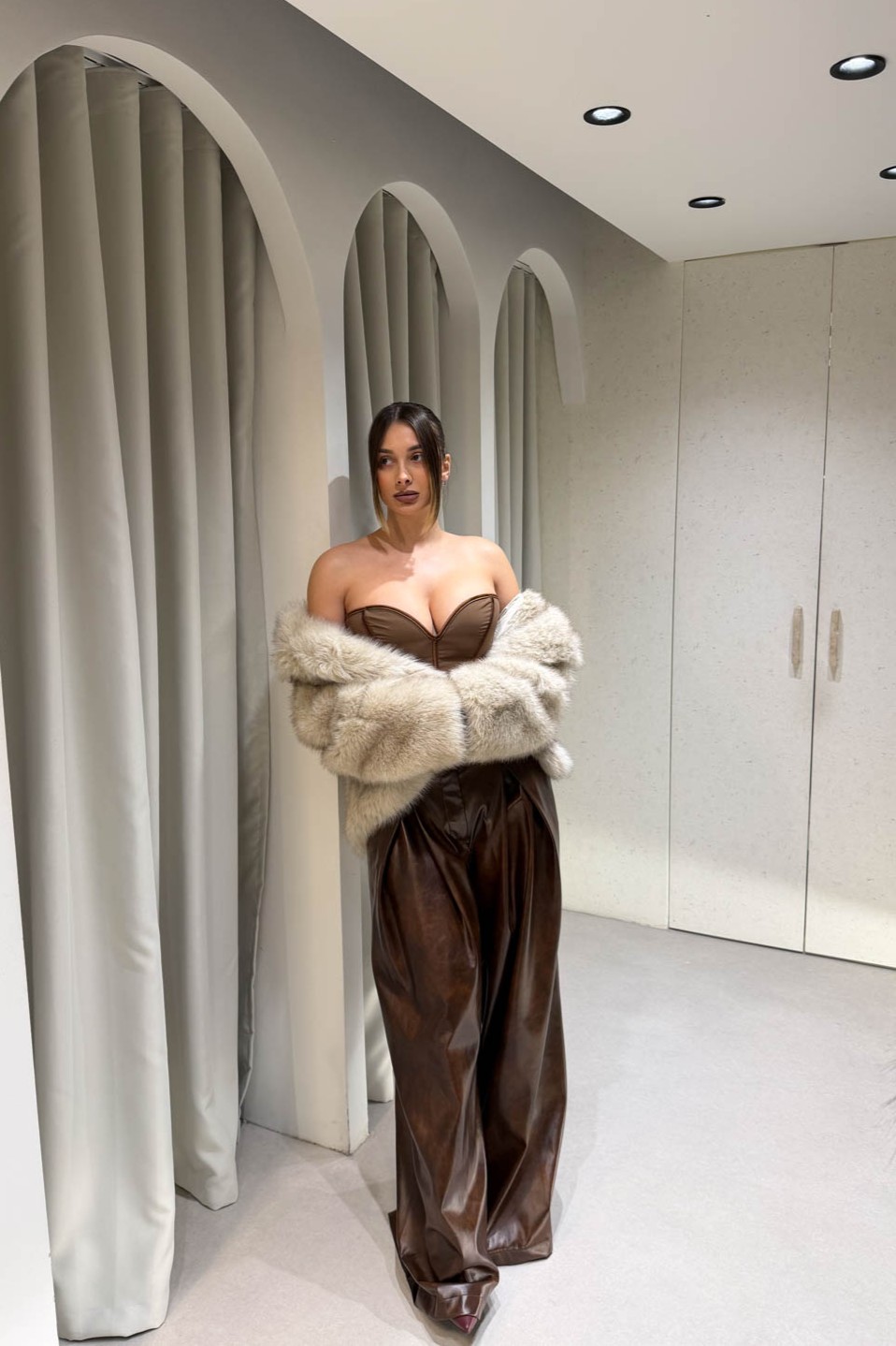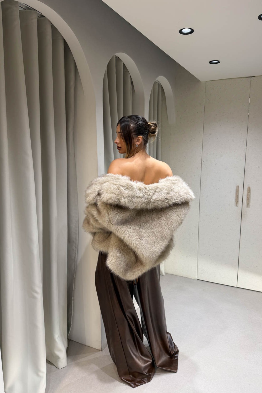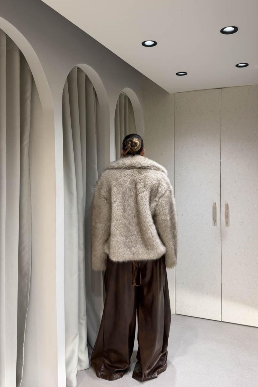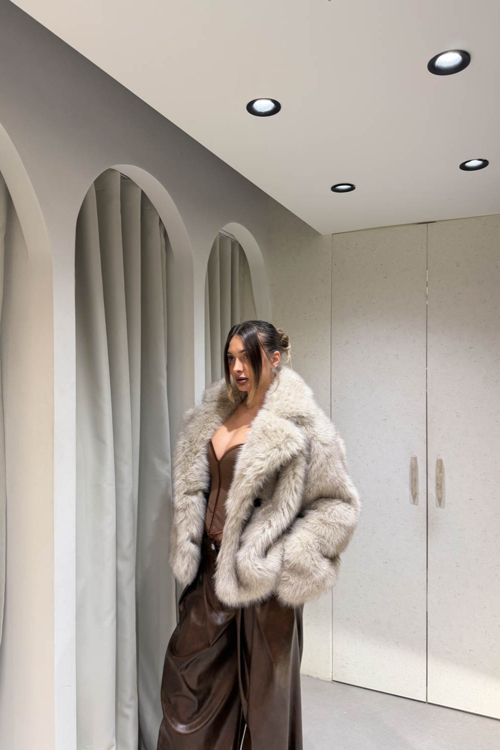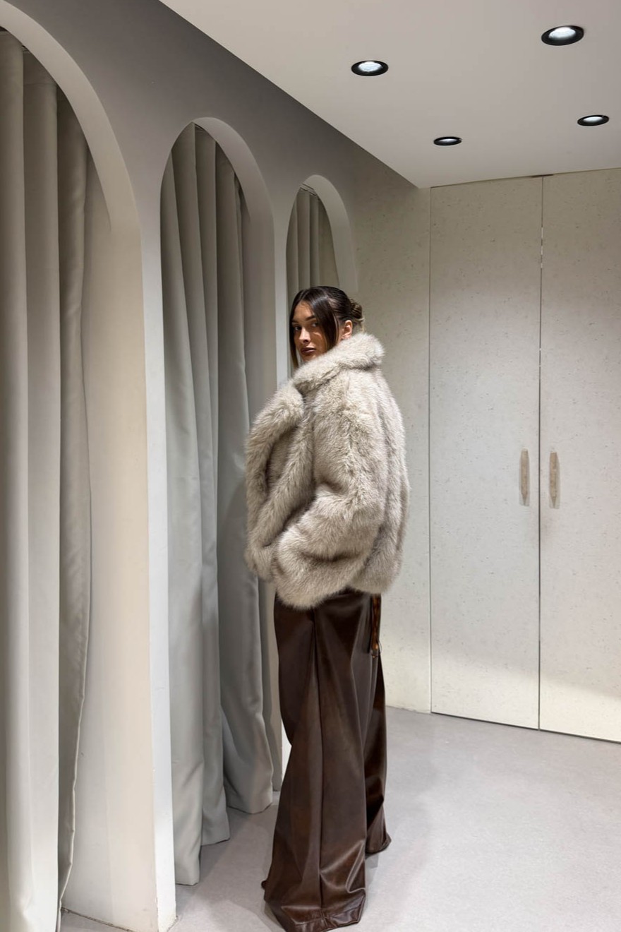 Γούνα του πάγου με μεγάλο γιακά και τσέπες κλείνει στο μπροστινό μέρος με κουμπιά