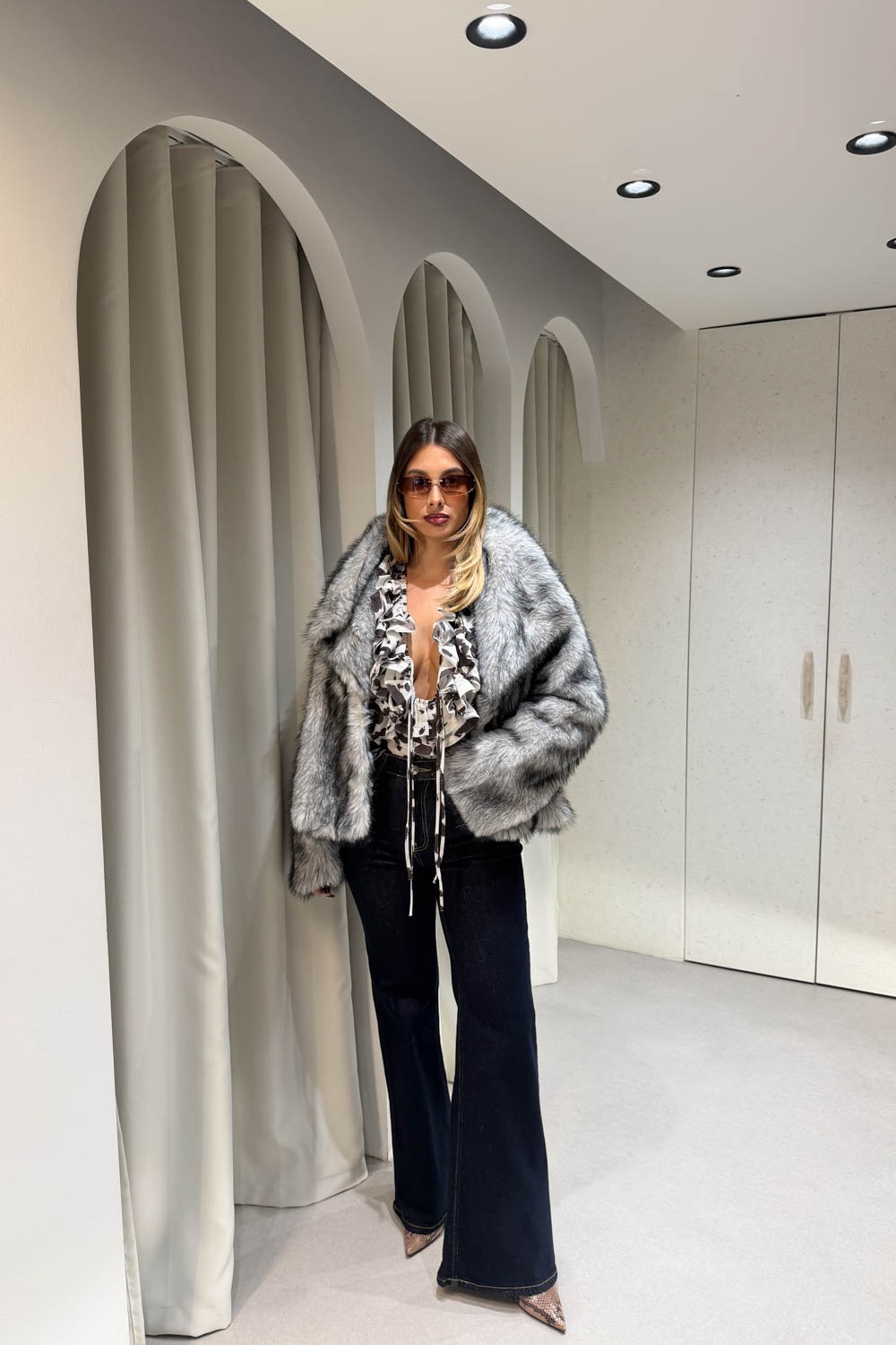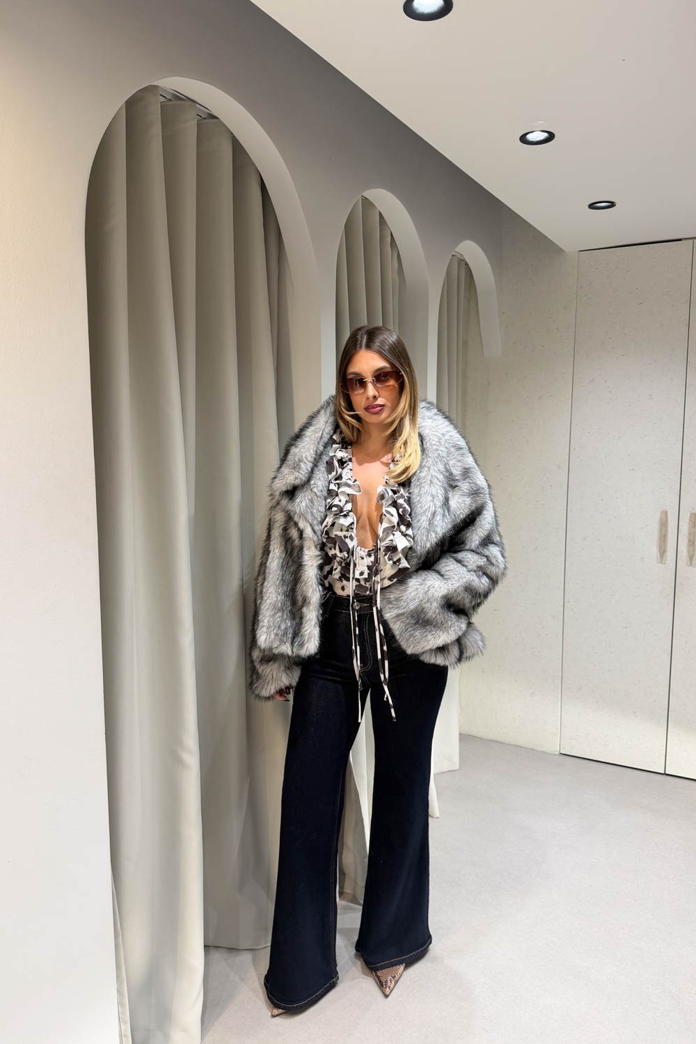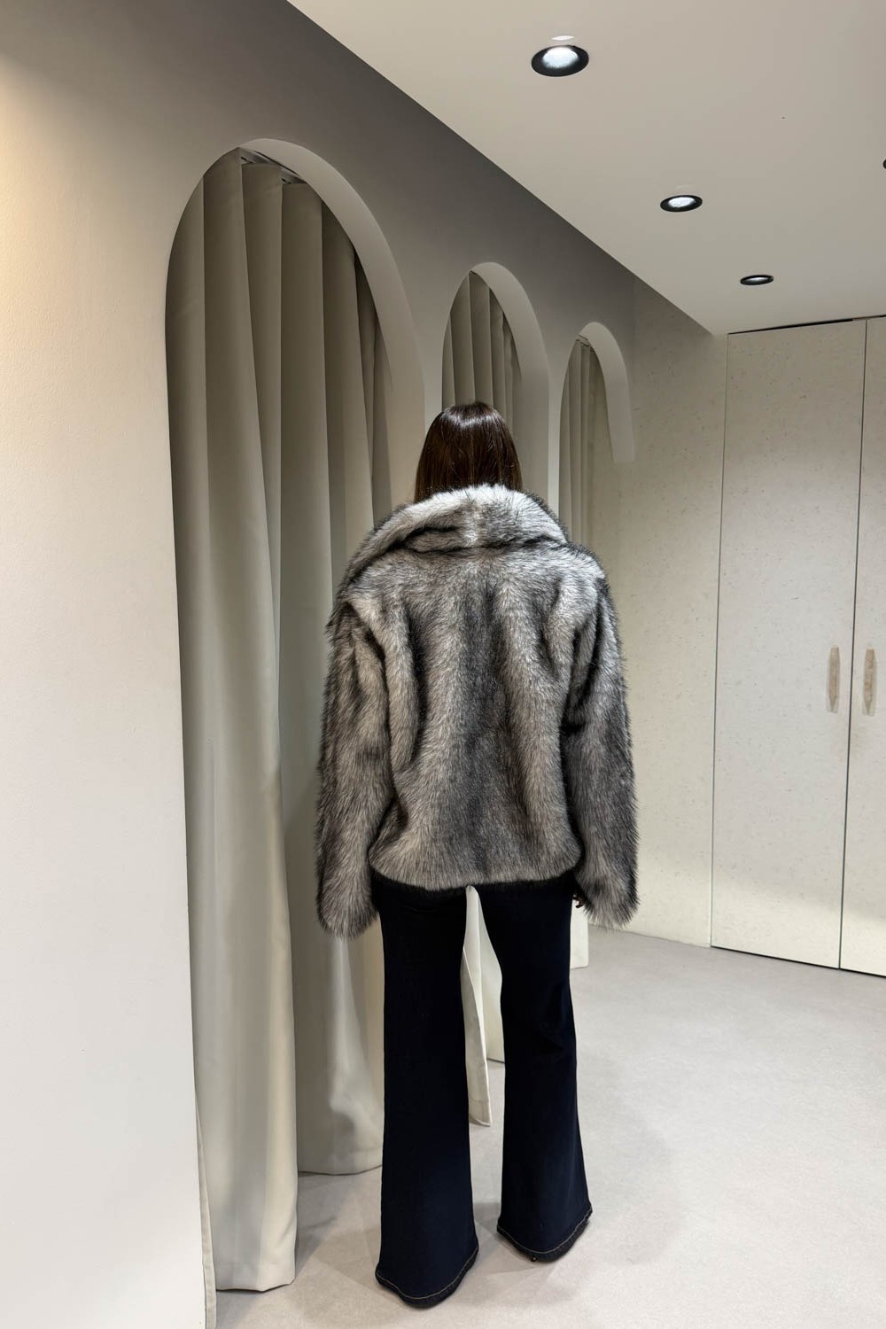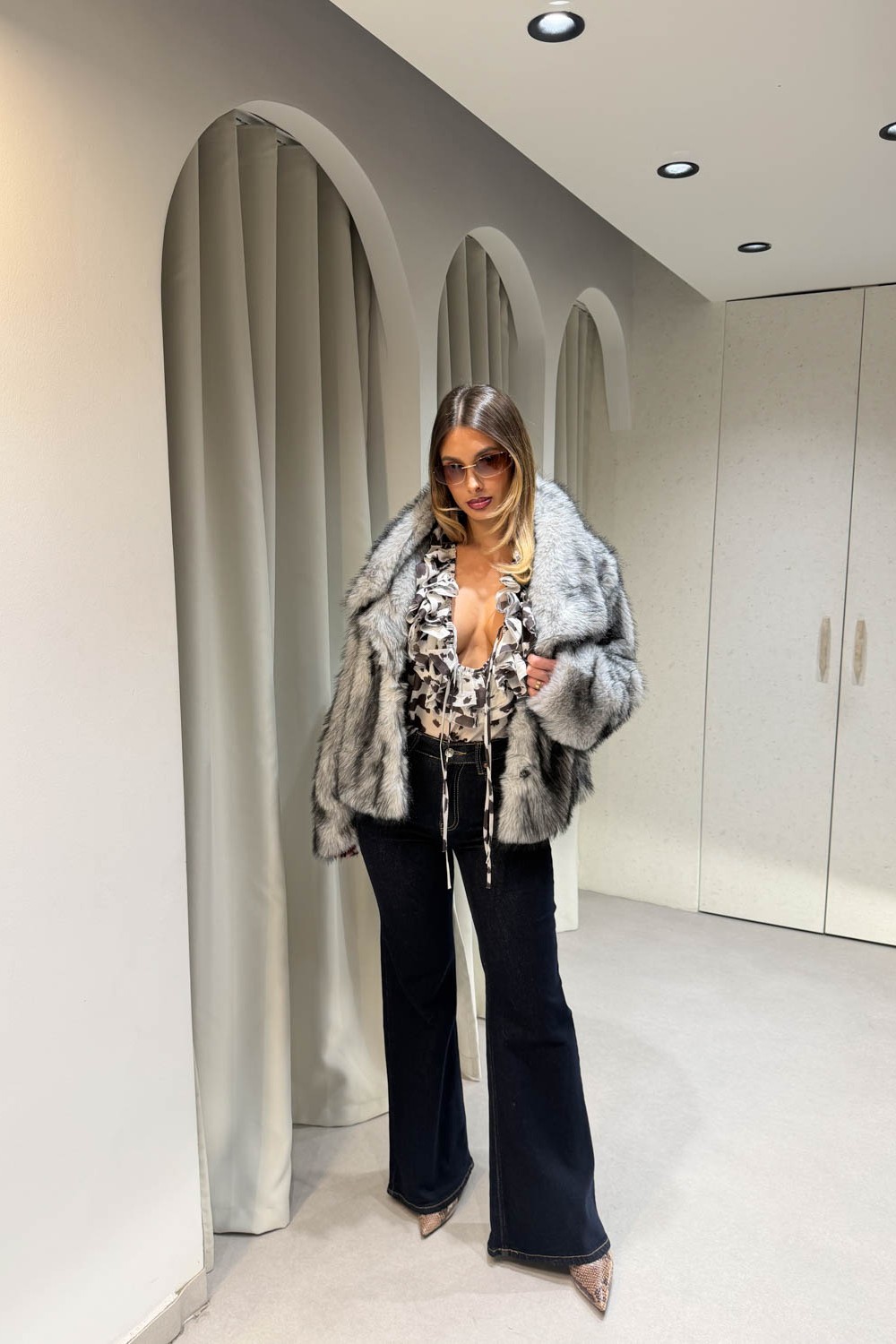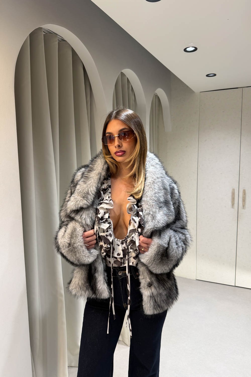 Γουνάκι ασπρόμαυρο διαθέτει μεγάλο γιακά και κλείνει στο μπροστινό μέρος με κουμπί