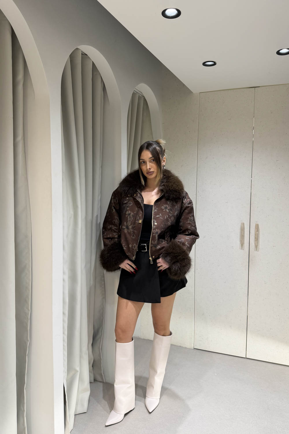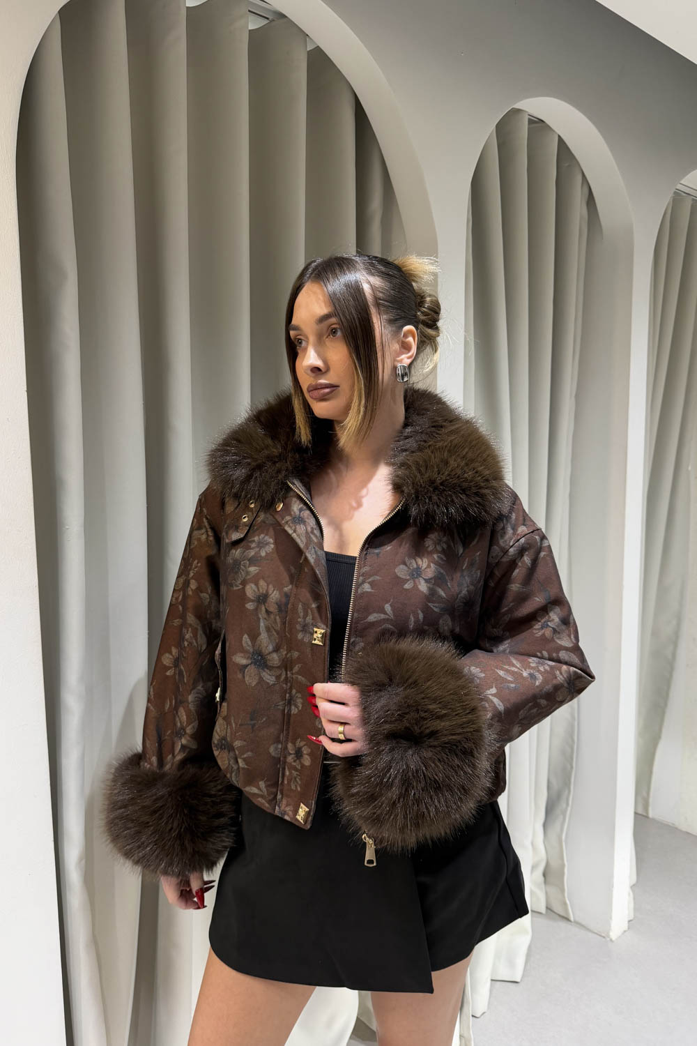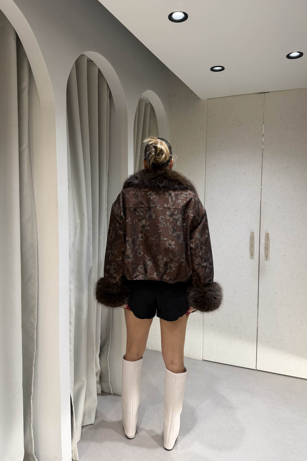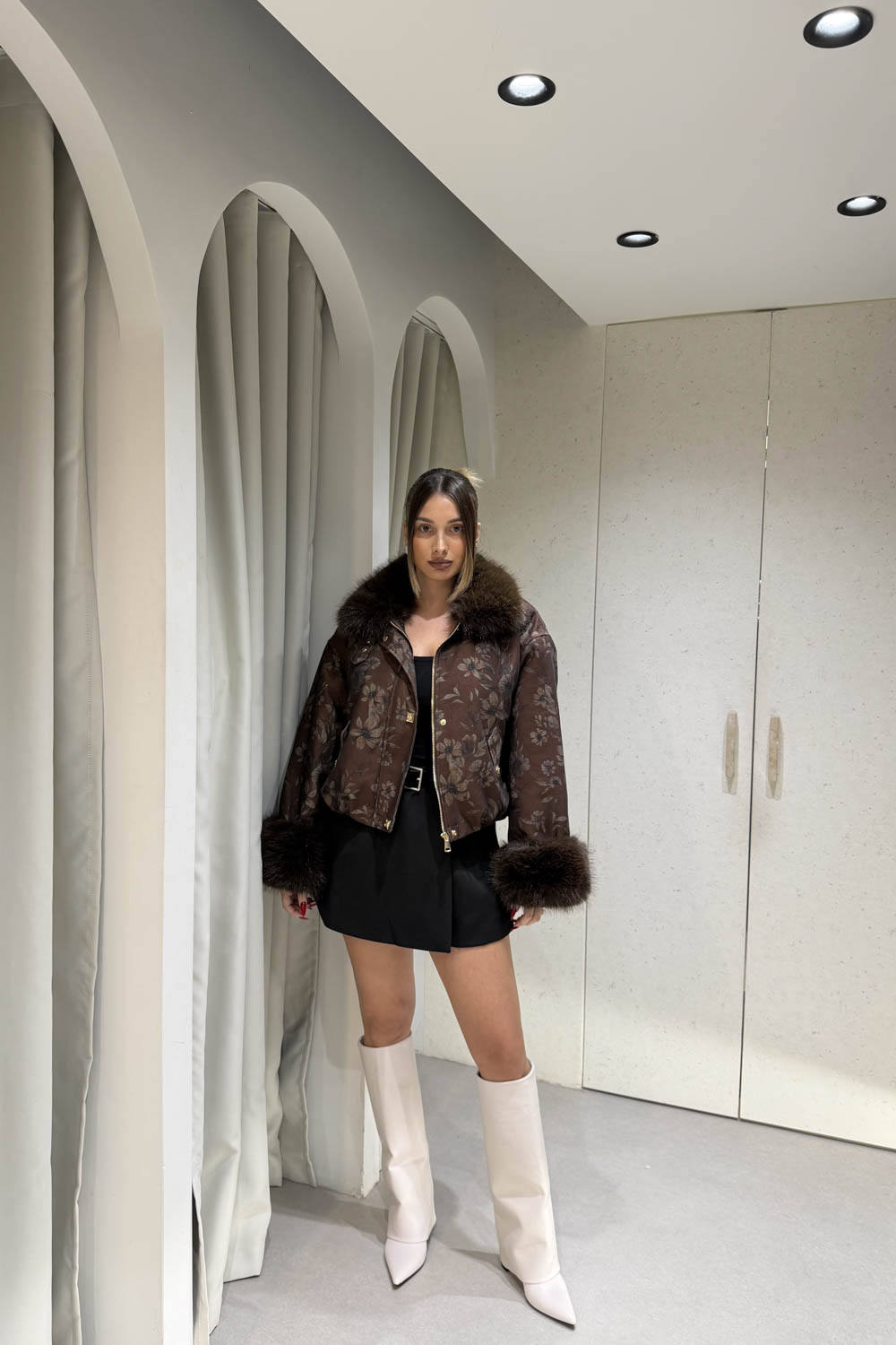 Jacket bomber flower με γούνινο γιακά και στις άκρες των μανικιών , εσωτερική γούνινη επένδυση, είναι crop και στο κάτω μέρος έχει λάστιχο στην μέση, περιέχει χρυσά κουμπιά στο μπροστινό μέρος και στις τσέπες και κλείνει με φερμούαρ και κουμπιά.
