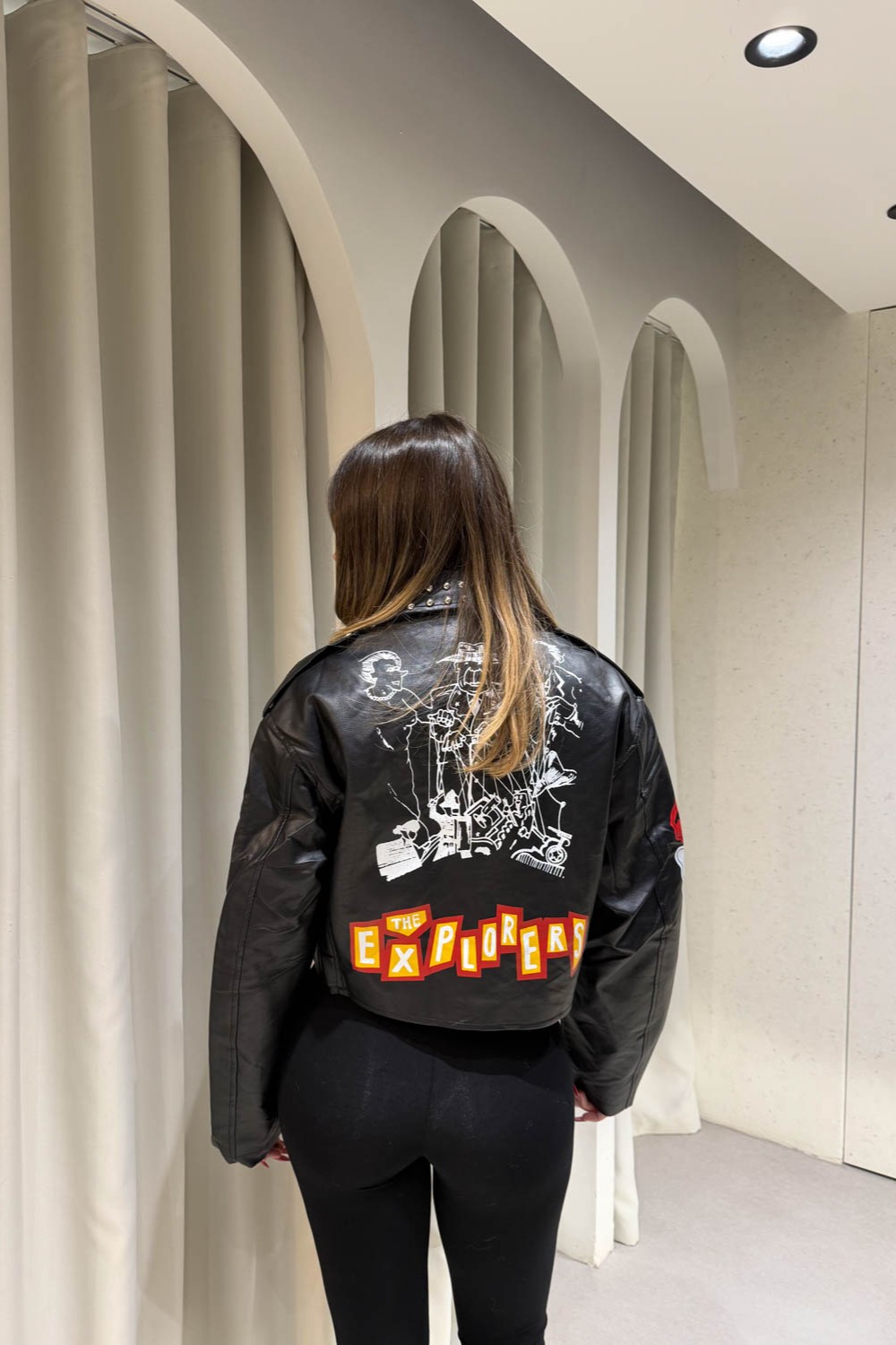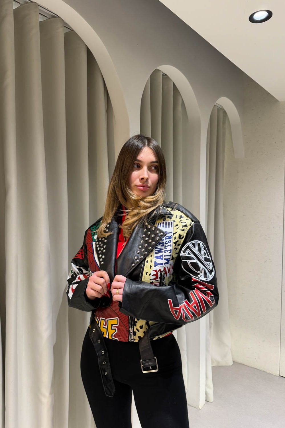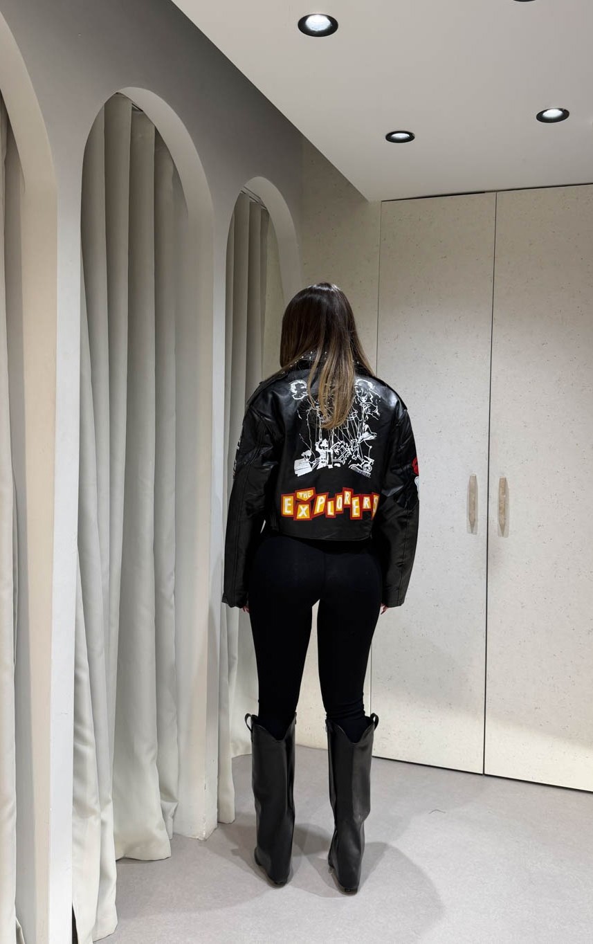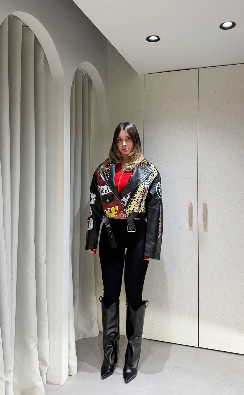 Jacket Νevada δερματίνη με τρουκς και πολύχρωμες στάμπες διαθέτει τσέπες και κλείνει στο μπροστινό μέρος με διαγώνιο φερμουάρ