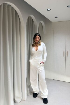 Jean baggy με λευκές γραμμές χιαστή έχει ίσια γραμμή διαθέτει τσέπες και θηλάκια για ζώνη και κλείνει στο μπροστινό μέρος με κουμπί