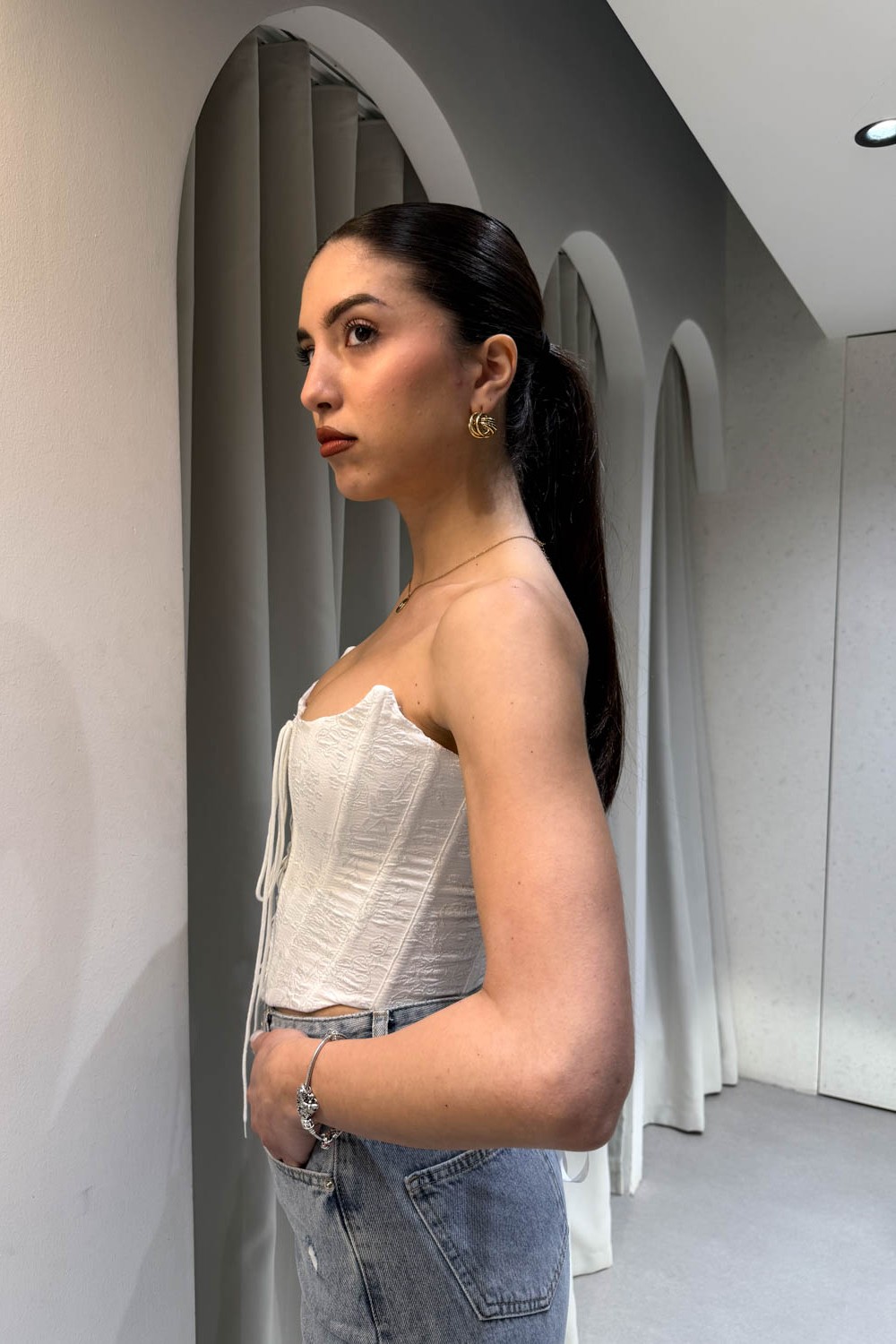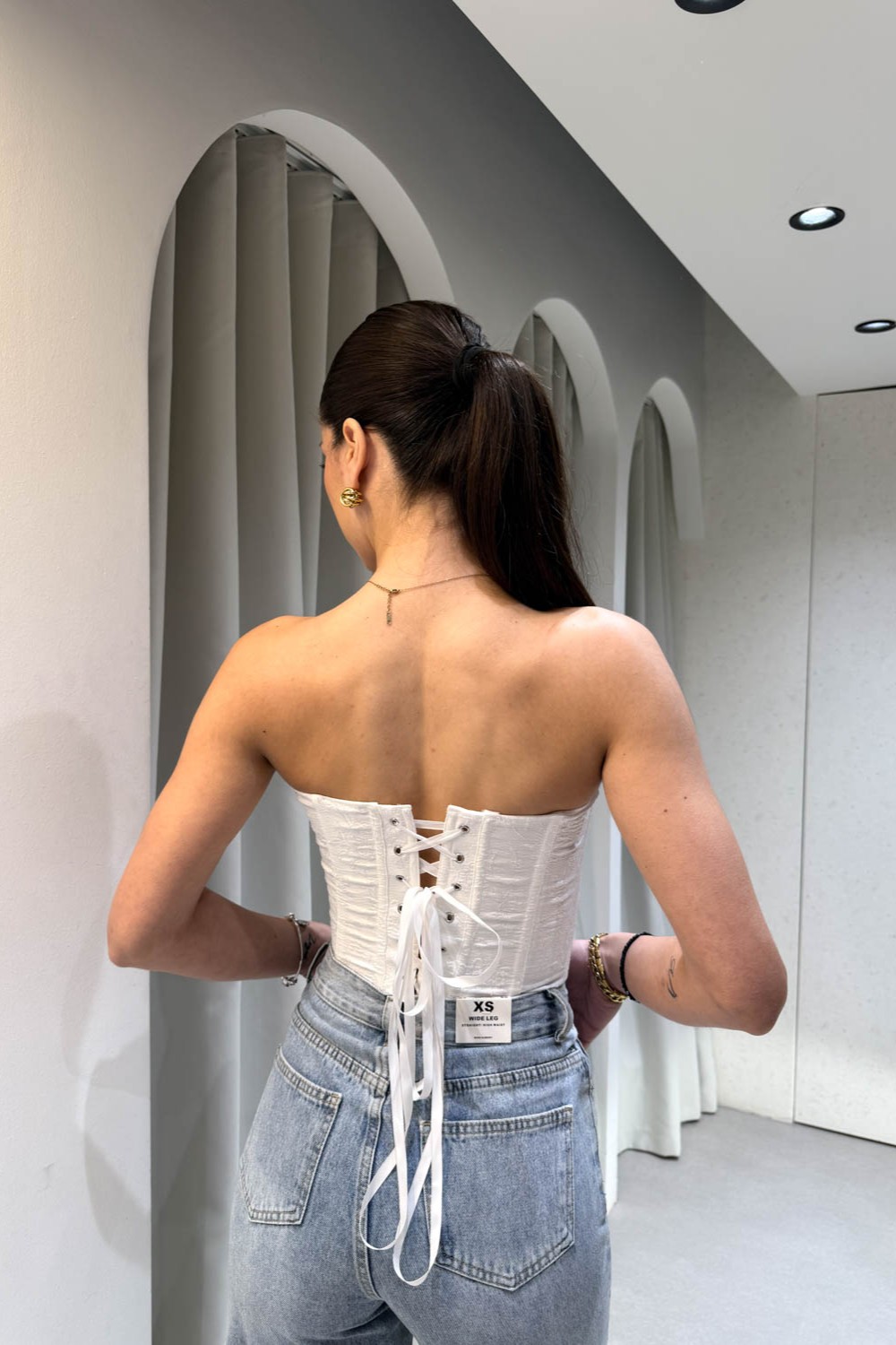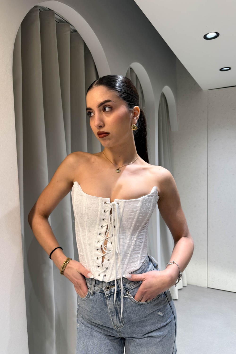 Κορσές με ανάγλυφα λουλούδια διαθέτει στο μπροστινό και πίσω μέρος κορδόνια για καλύτερη εφαρμογή