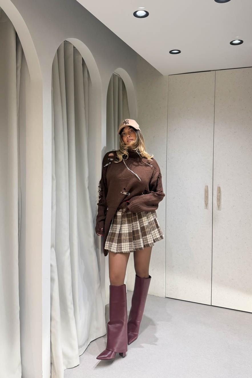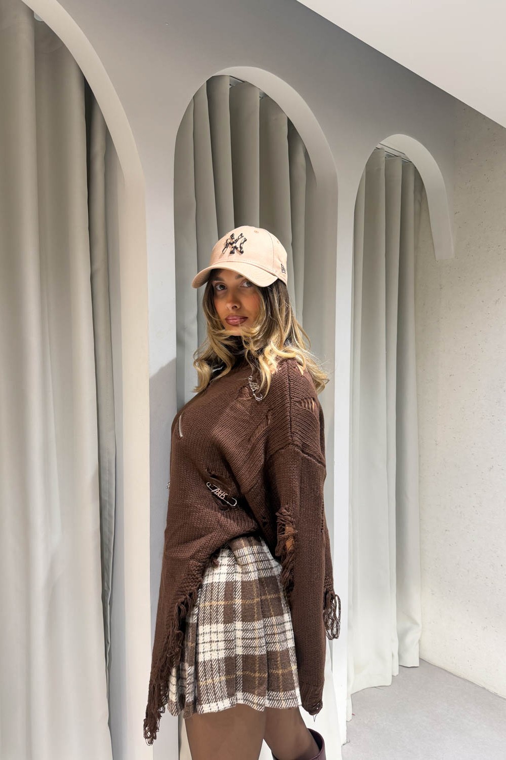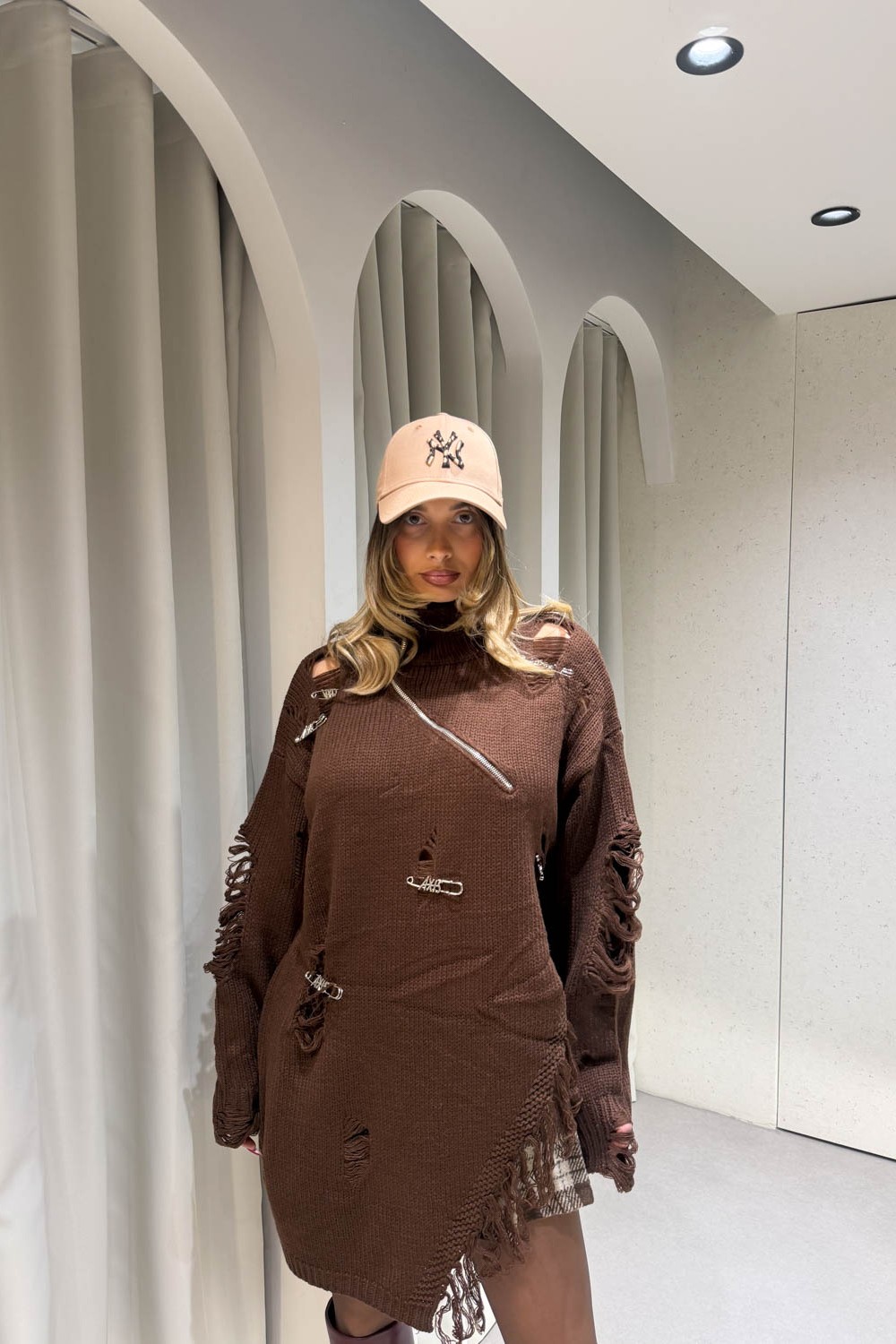 Μπλούζα ζιβάγκο oversized πλεκτή με σκισίματα και καρφίτσες και στο πλάι περιέχει άνοιγμα με ξέφτια