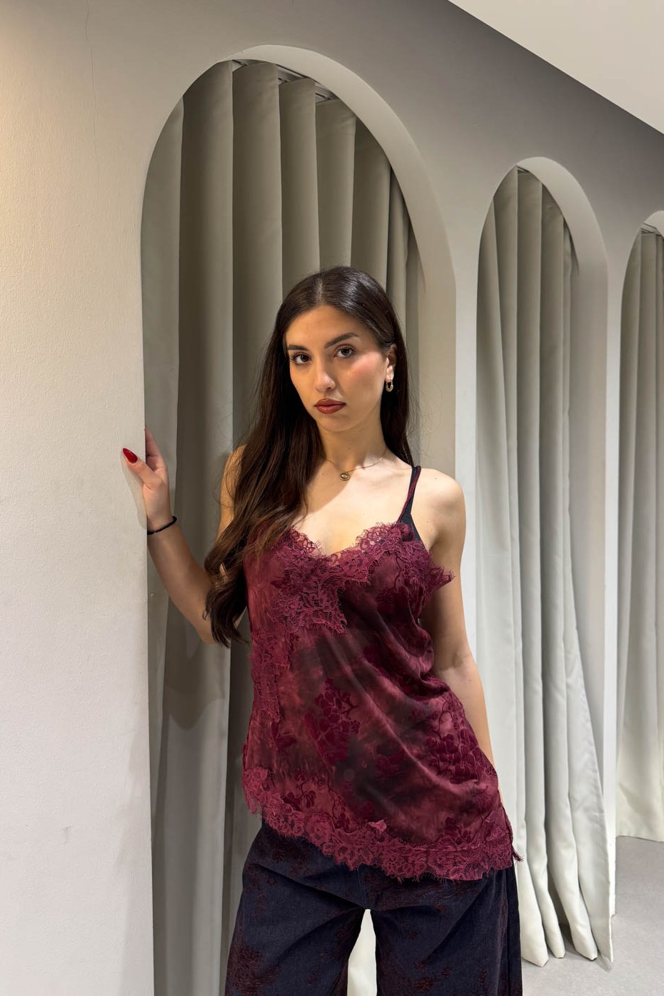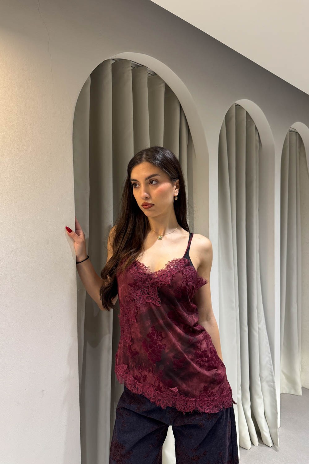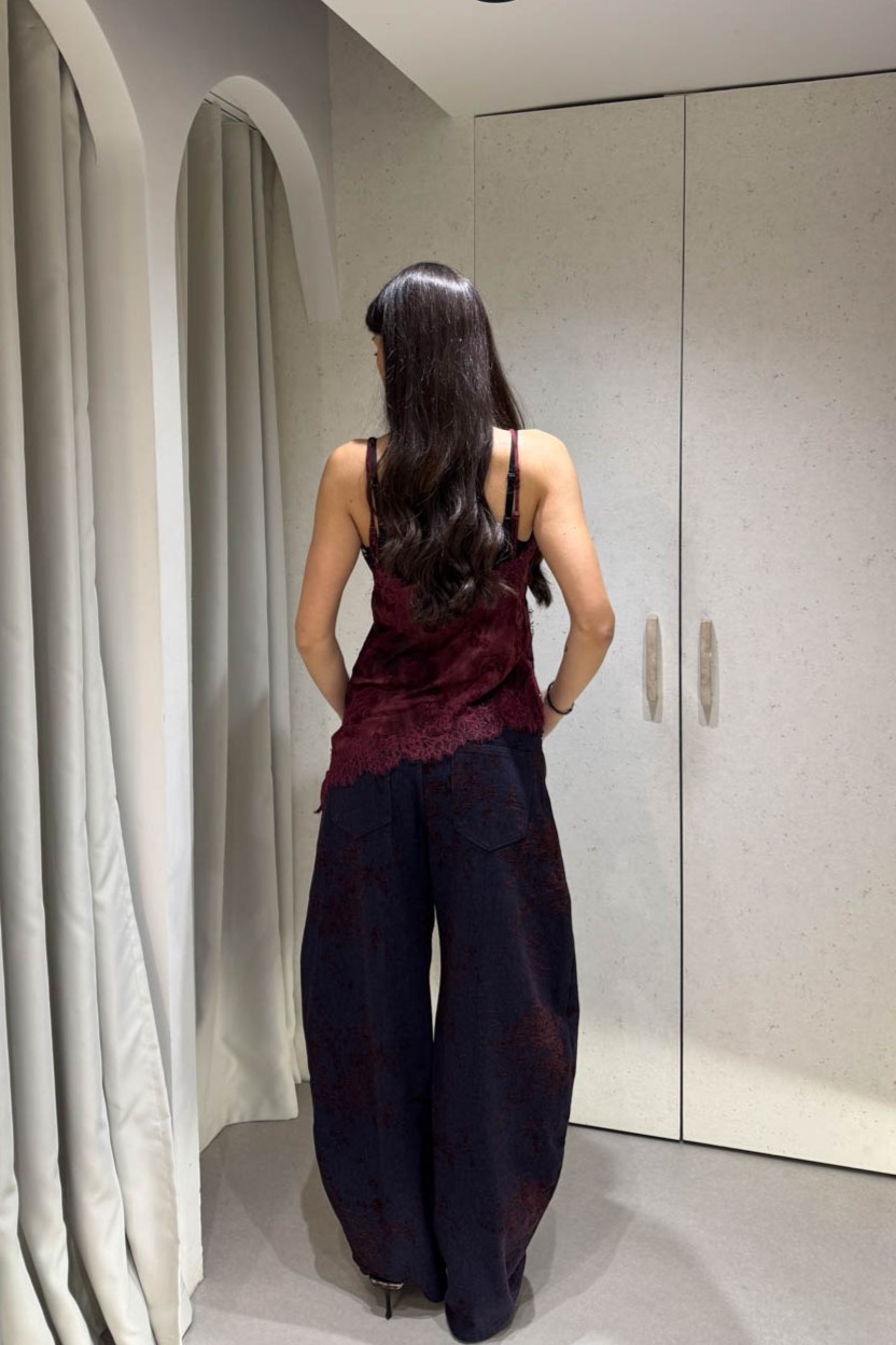 Μπλούζακι ραντάκι με φλοράλ σχέδιο σιθρού , διαθέτει τιράντα που μαζεύει , ασύμμετρο κόψιμο και δαντέλα στα τελειώματα.