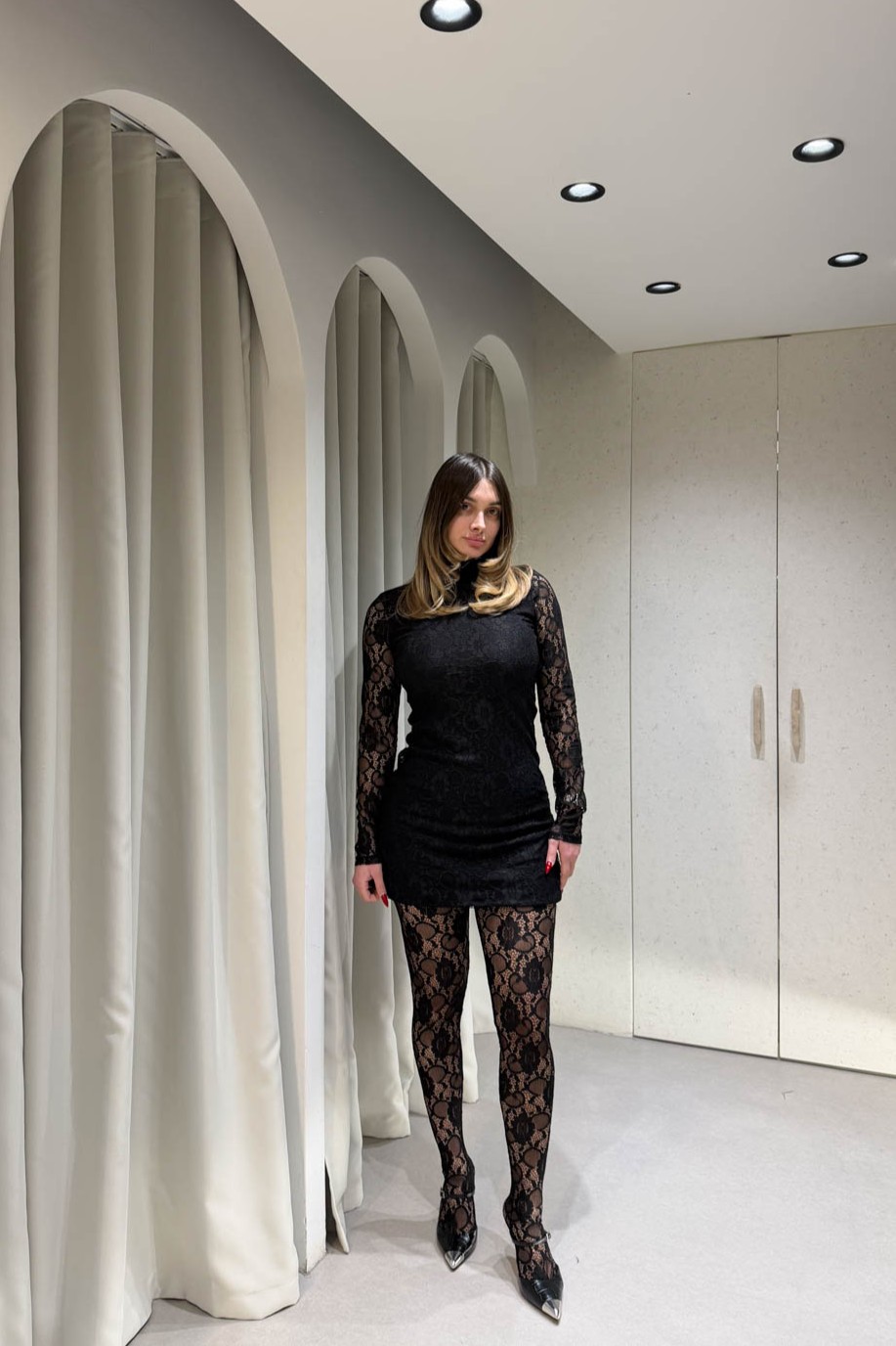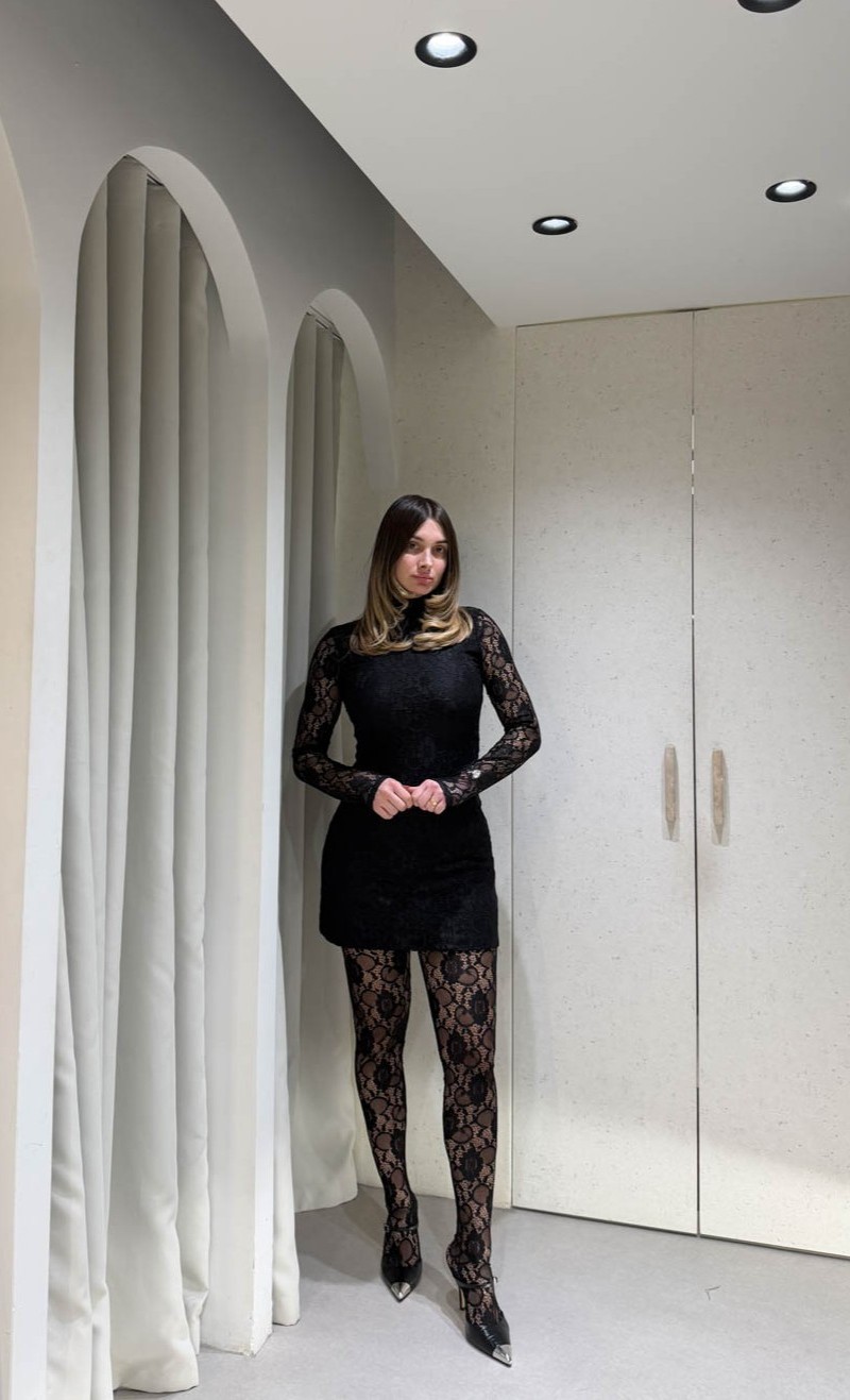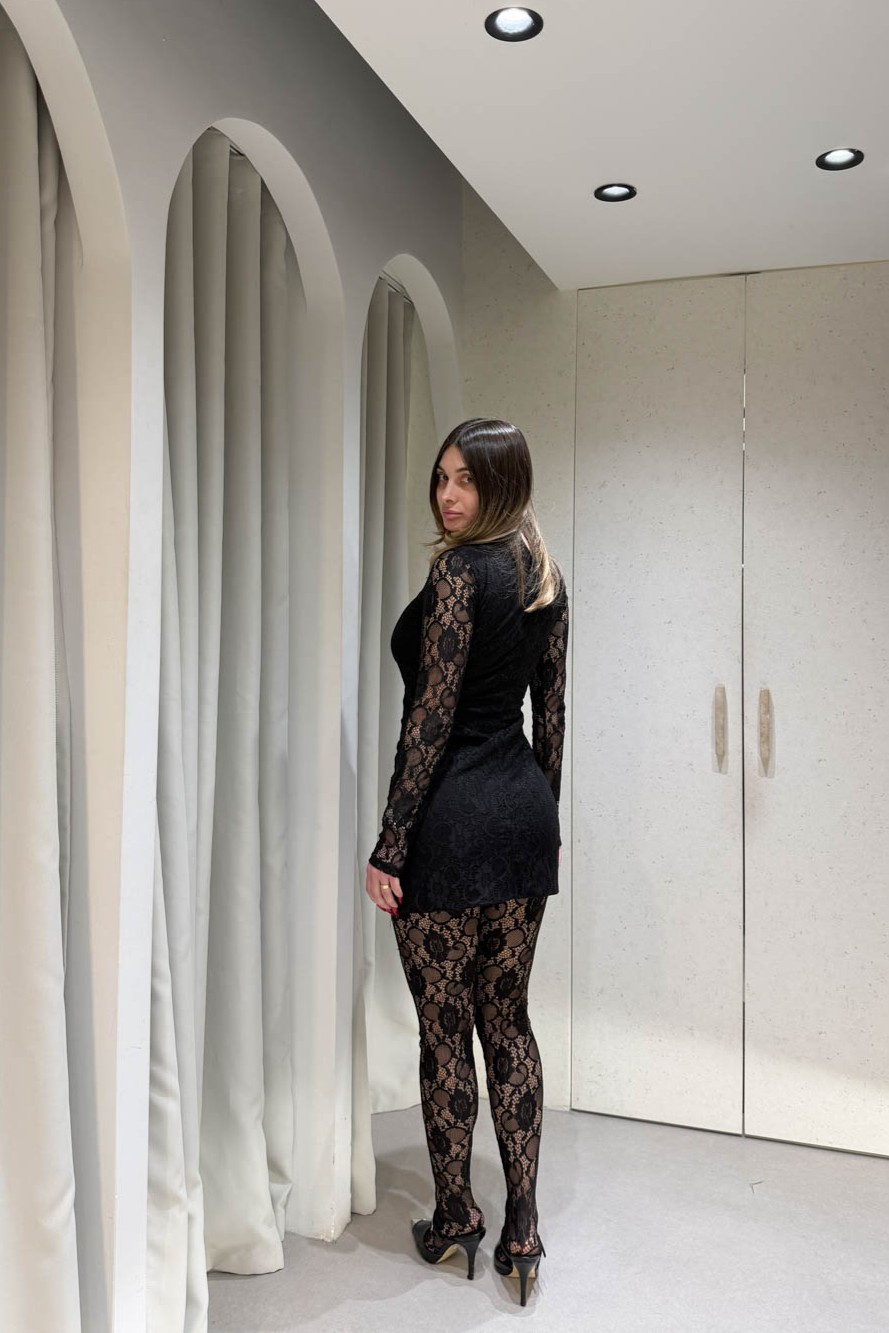 Μπλουζοφόρεμα δαντέλα με μακρύ μανίκι και ψηλό λαιμό, που αναδεικνύει τη θηλυκότητα με κομψό και εντυπωσιακό τρόπο. Ιδανικό για βραδινές και ιδιαίτερες εμφανίσεις.