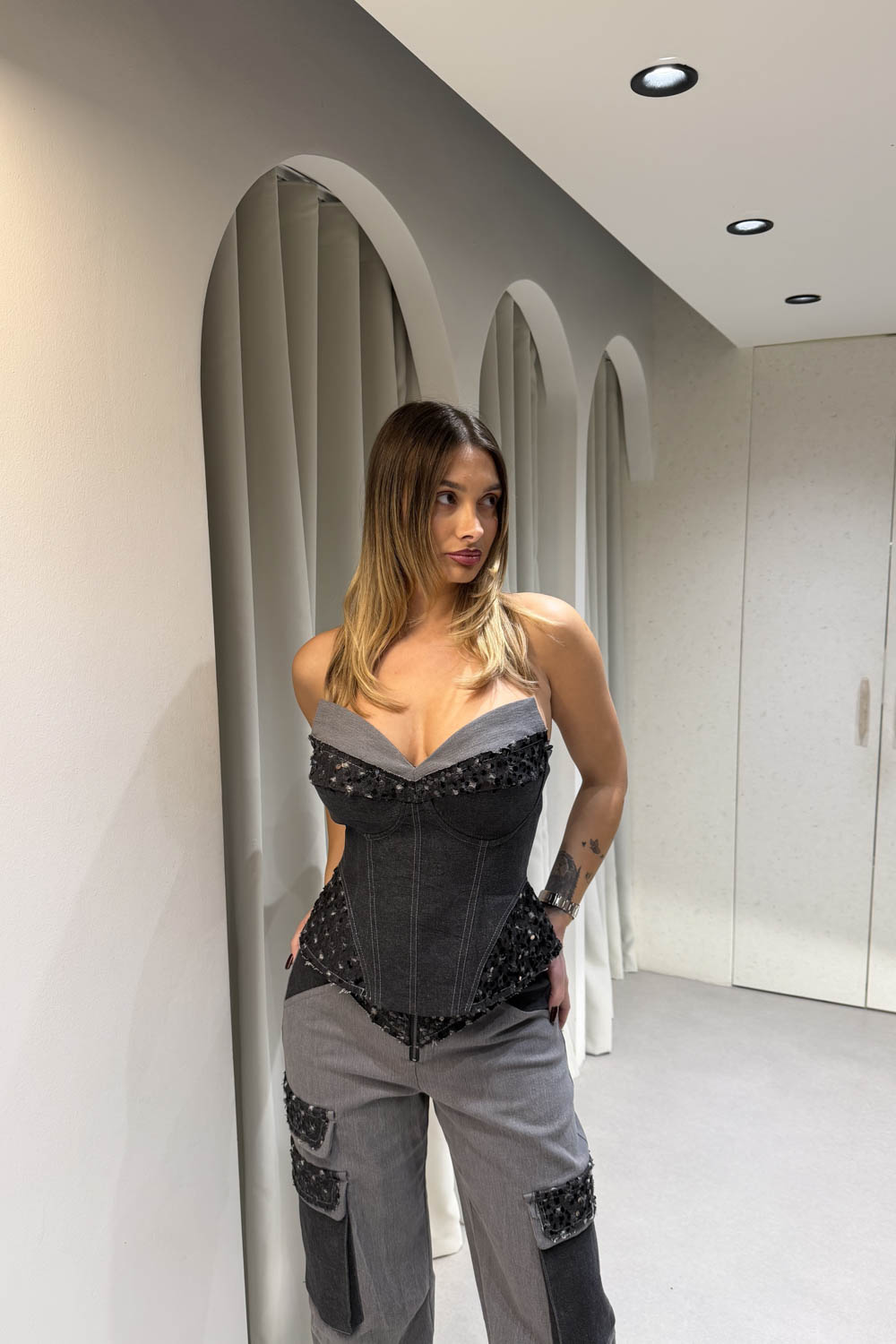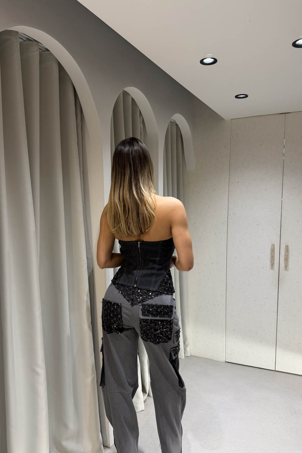 Μπούστο με παγιέτα και jean λεπτομέρεια , κλείνει στο πίσω μέρος με φερμουάρ