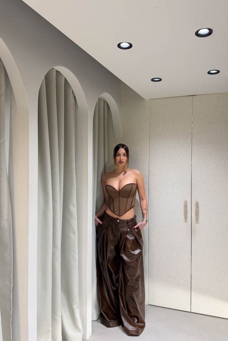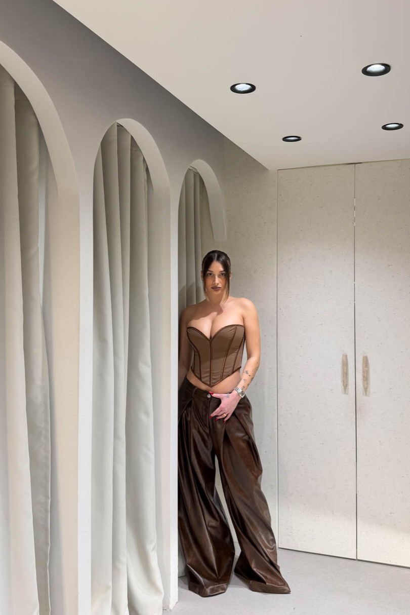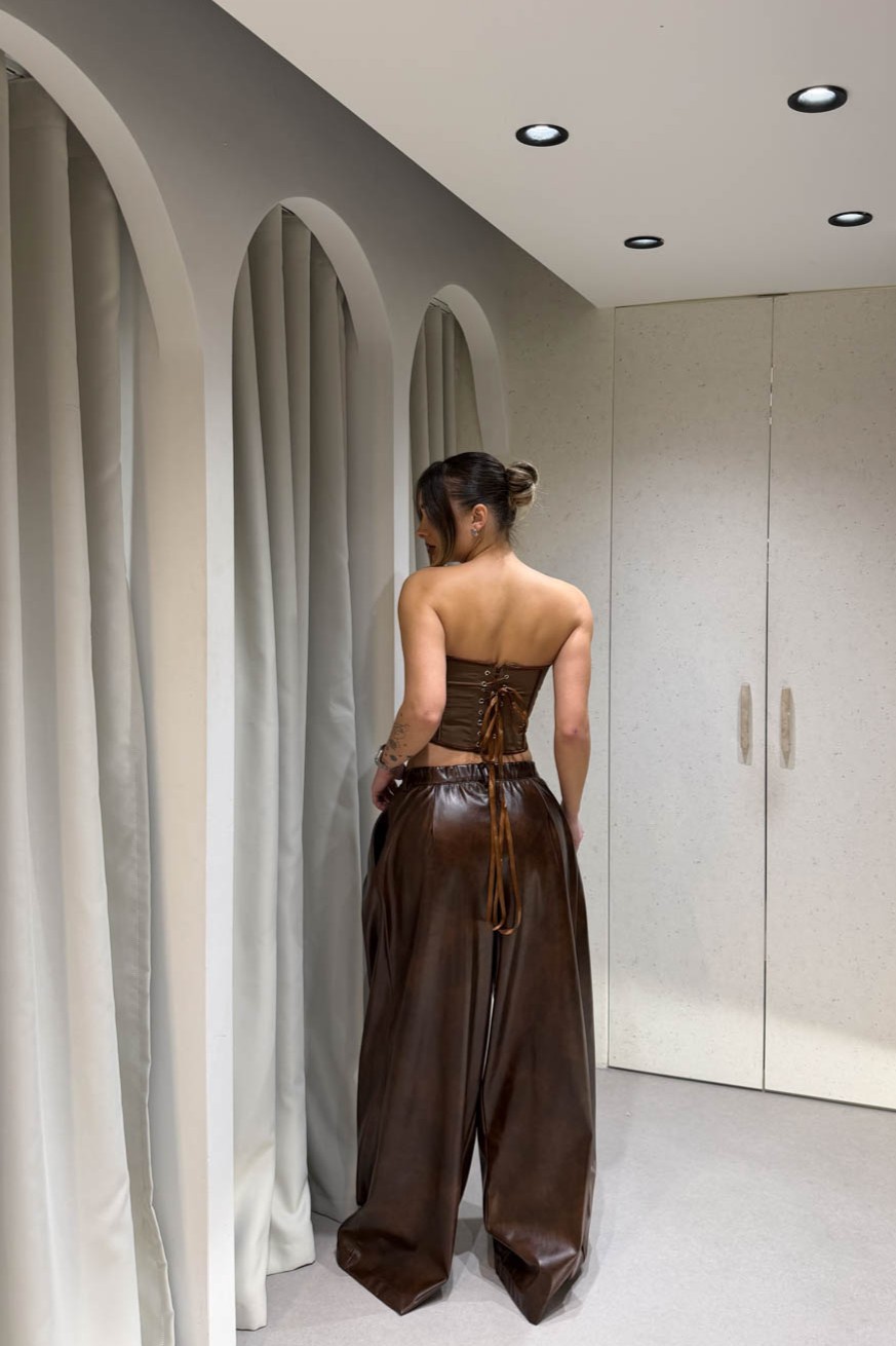 Παντελόνι baggy δερματίνη με πιέτες διαθέτει τσέπες και θηλάκια για ζώνη. Κλείνει στο μπροστινό