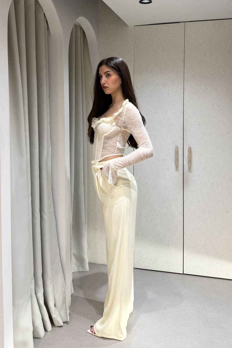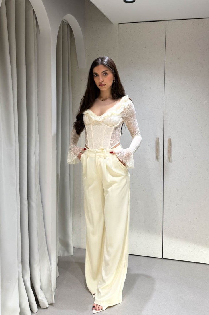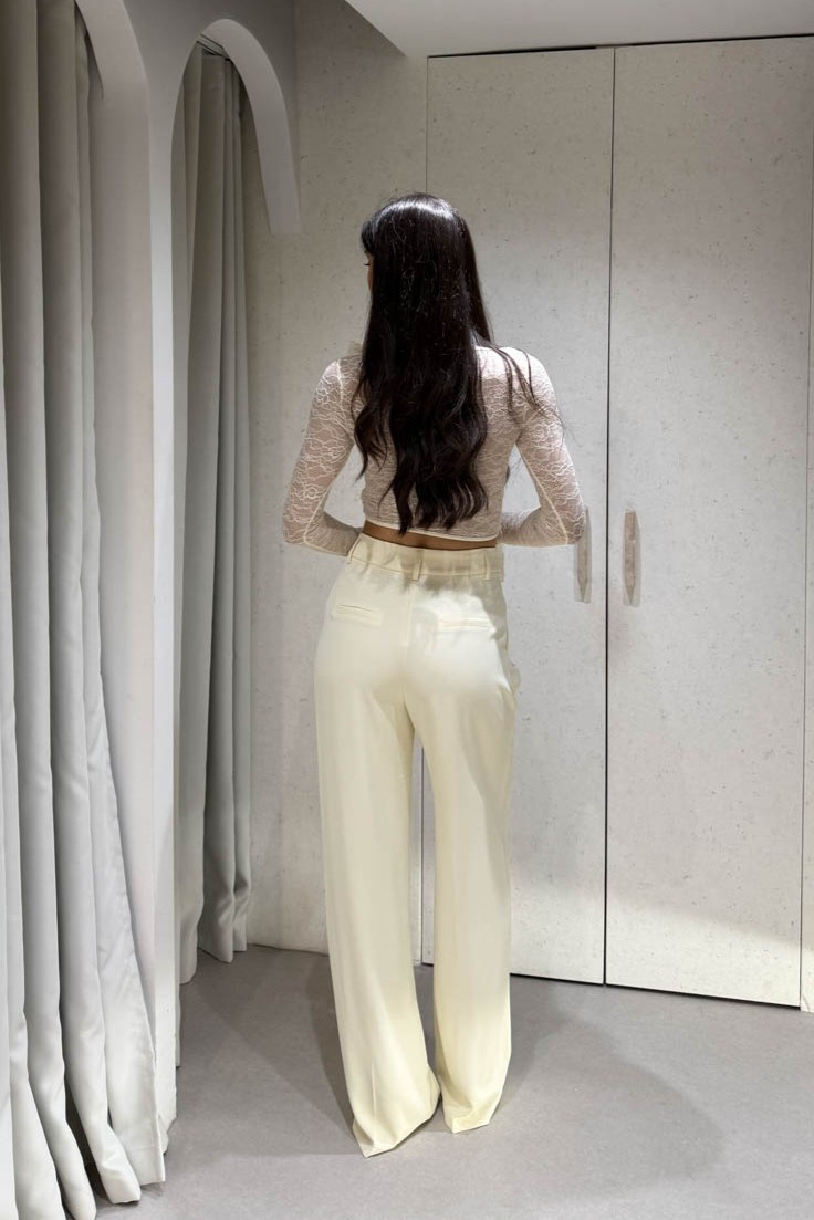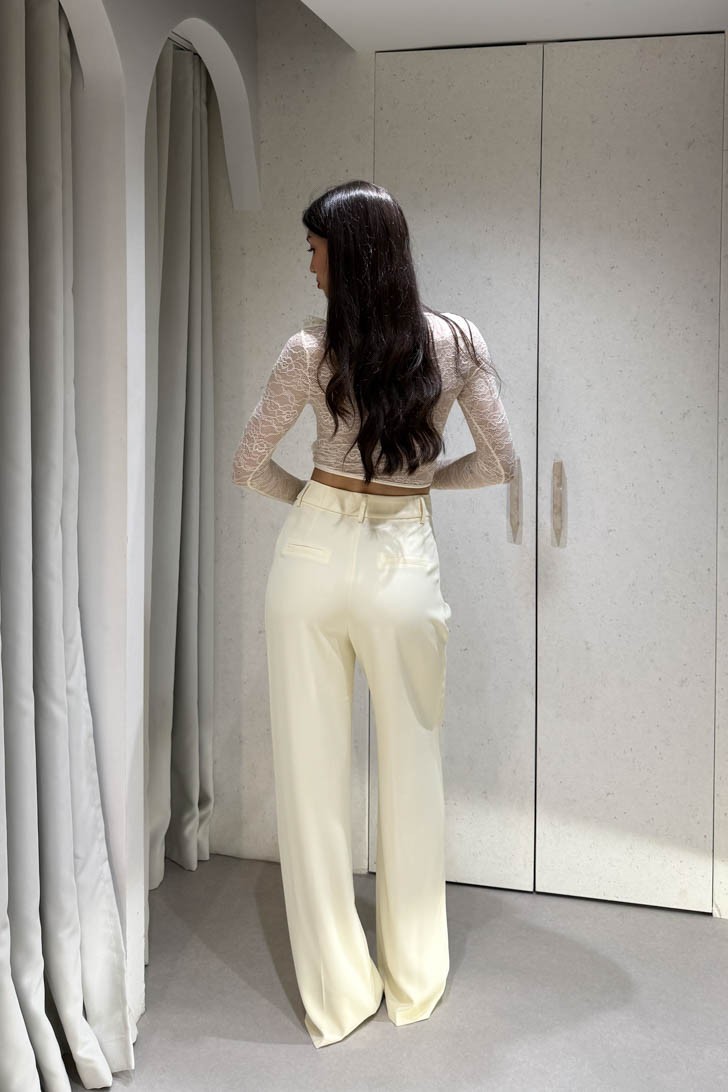 Παντελόνι ίσιο μακρύ με πιέτες περιέχει δύο τσέπες και κλείνει στο μπροστινό μέρος με κόπιτσα