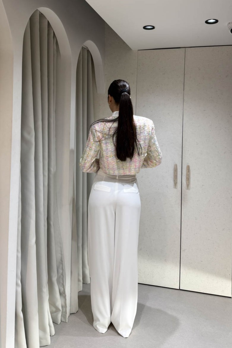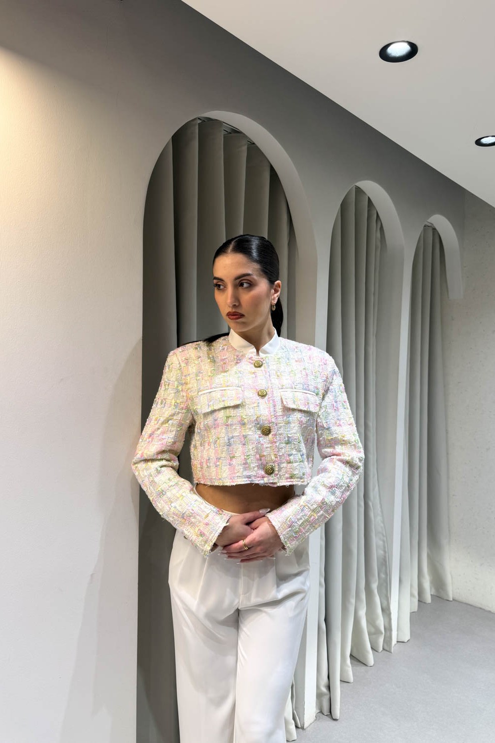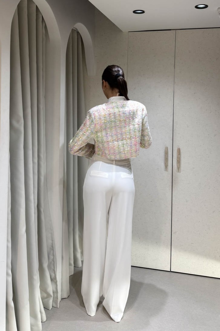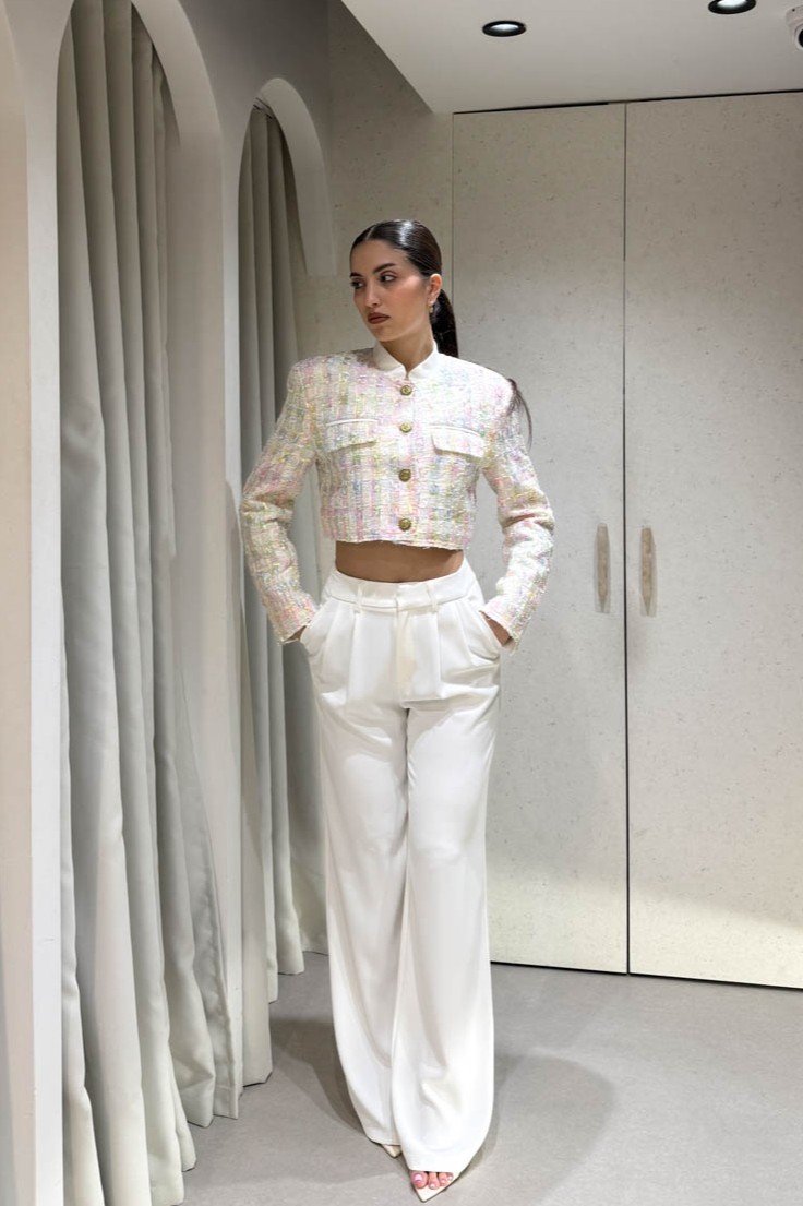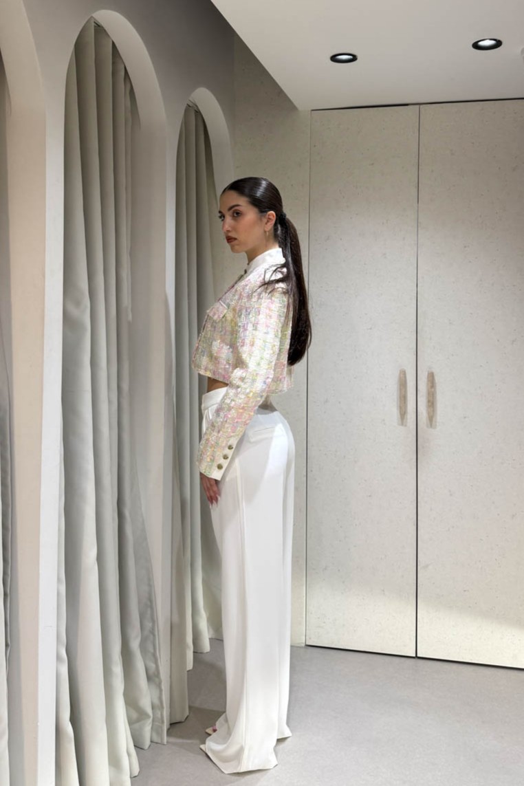 Σακάκι καρό πολύχρωμο κοντό , περιέχει βάτες και κλείνει στο μπροστινό μέρος με χρυσά κουμπιά.