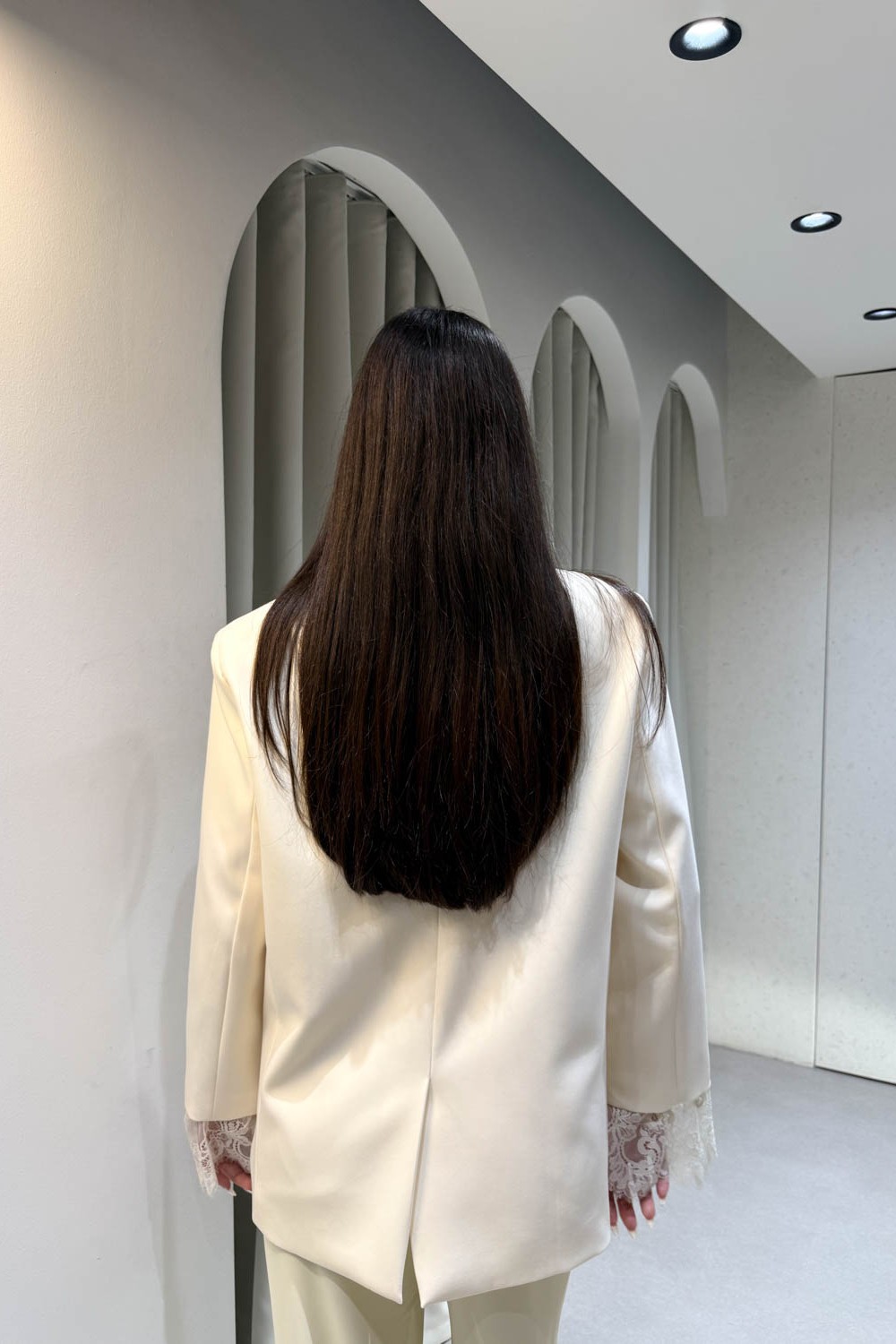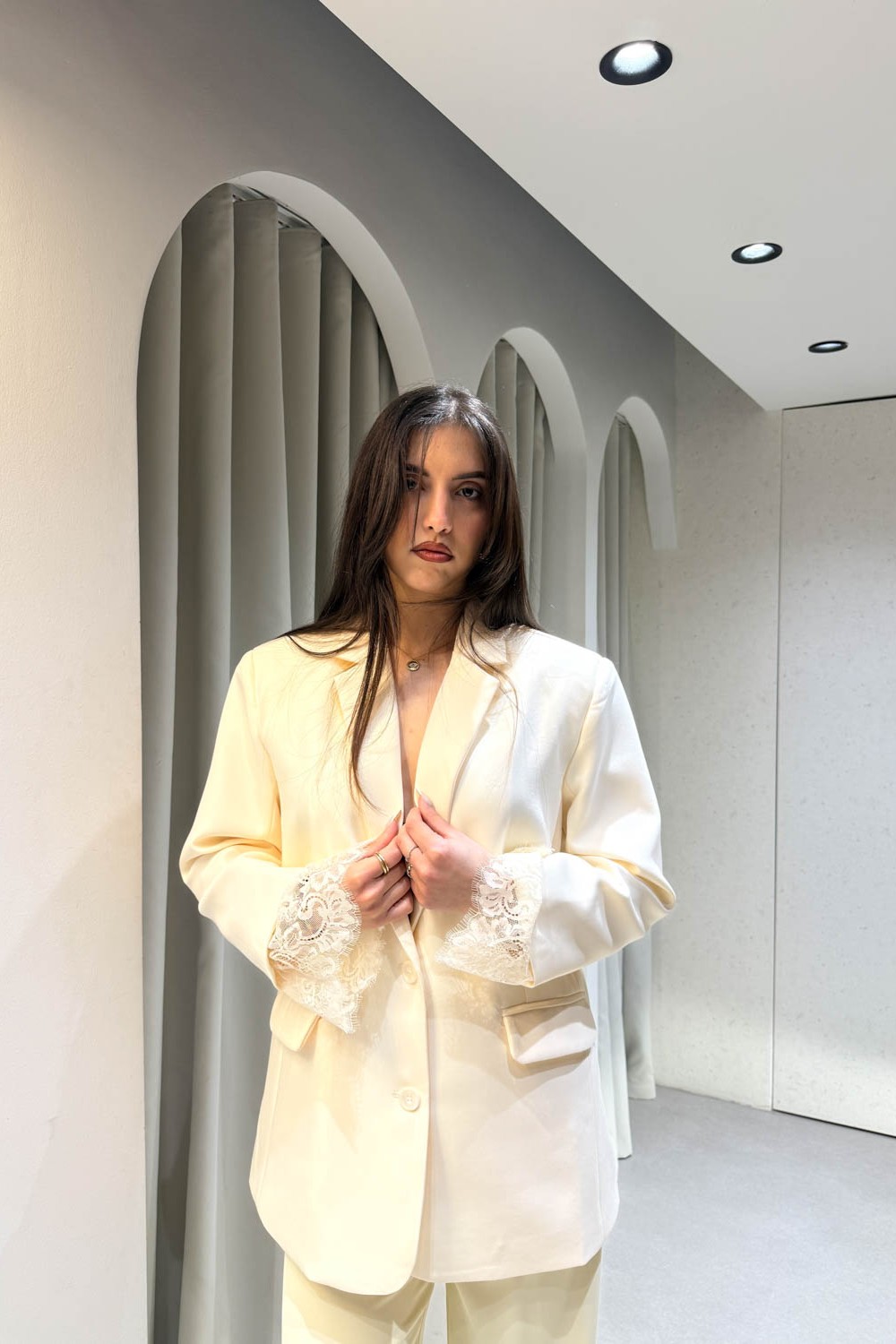 Σακάκι oversized με λεπτομέρεια δαντέλας στα μανίκια και κλείνει στο μπροστινό μέρος με κουμπί