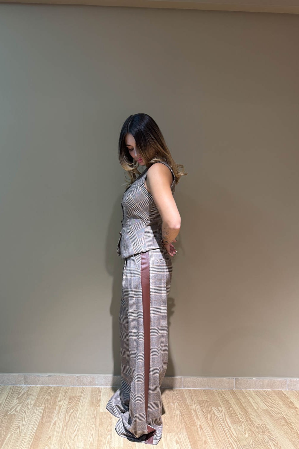 Υλικό : 65% PES 31% VIS 3% SP 1% MET Παντελόνι καρό , περιέχει δερμάτινη λωρίδα στο πλάι , δυο τσέπες στο μπροστινό μέρος και κλείνει με κουμπί