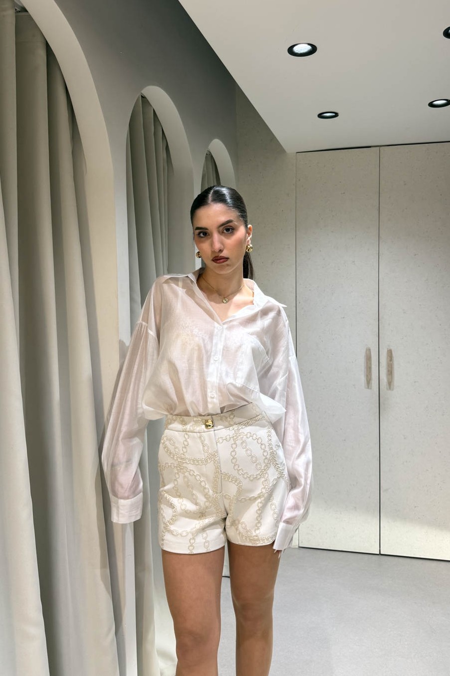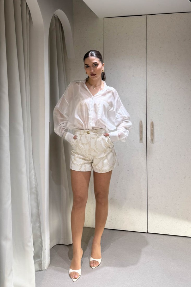 Σορτσάκι με χρυσές αλυσίδες που περιέχει δύο τσέπες και κλείσιμο στο μπροστινό μέρος με χρυσό κουμπί