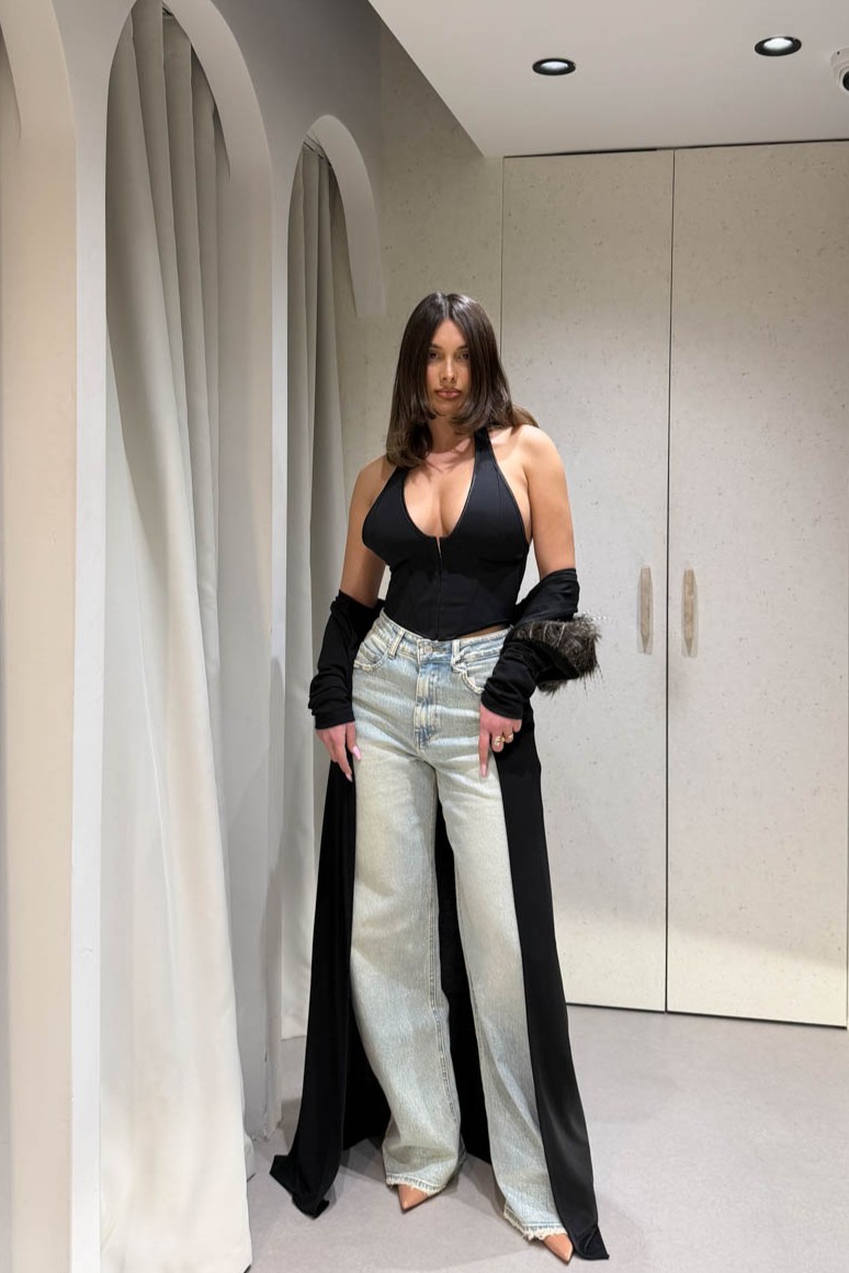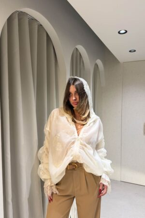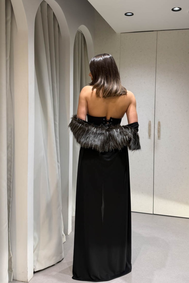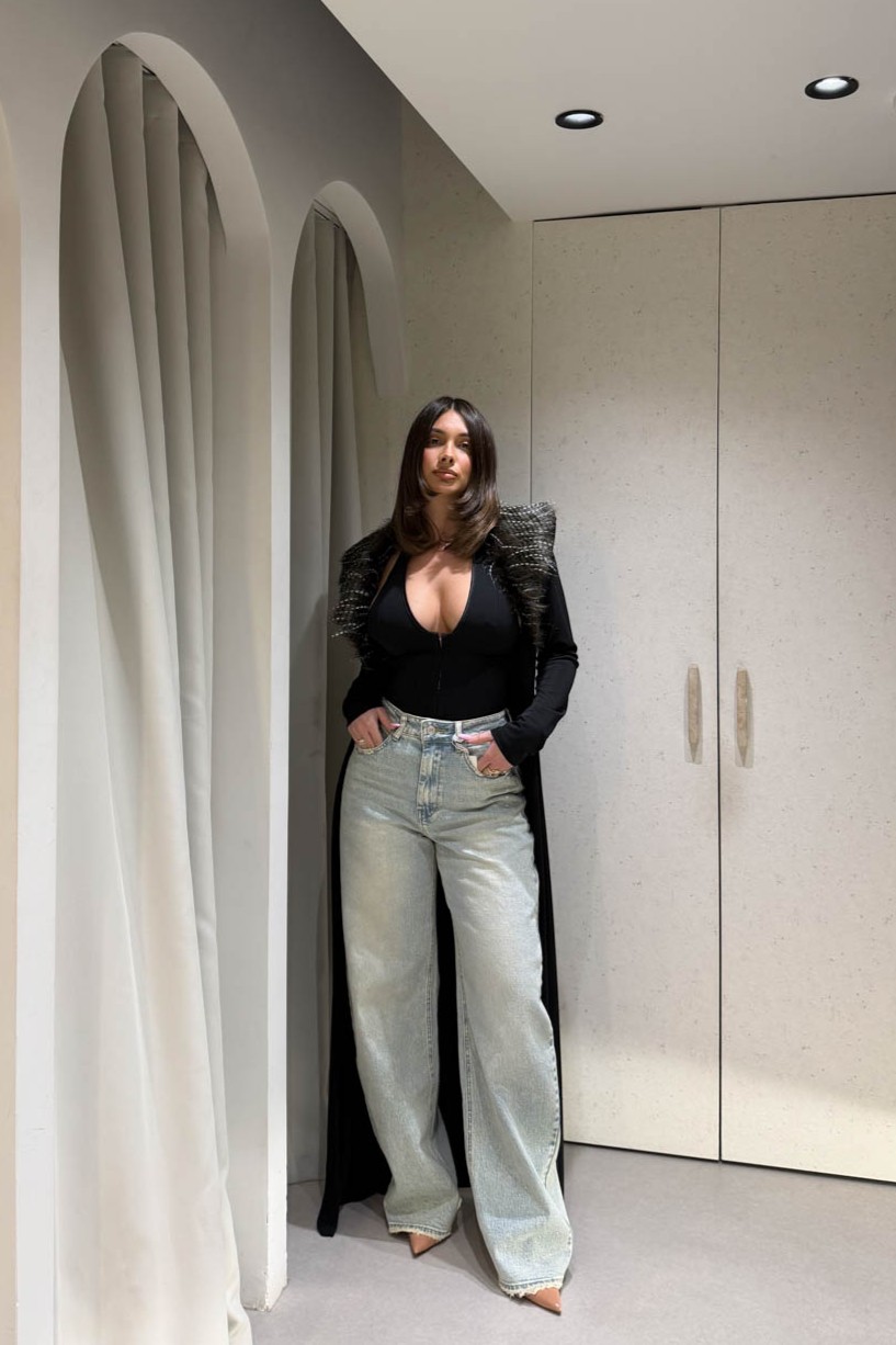 Ζακέτα μακρυά μακρυμάνικη με ενσωματωμένη γούνα στον γιακά και κλείνει στο μπροστινό μέρος με ένα κουμπί