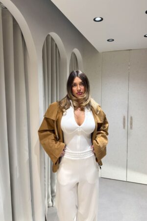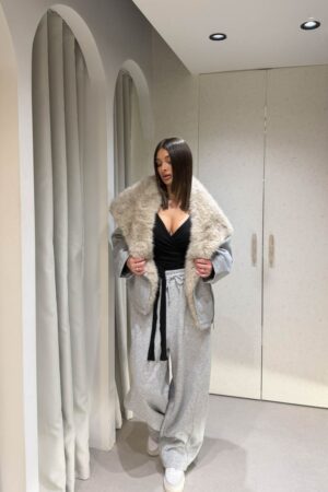 Ζακέτα μακρυά μακρυμάνικη με ενσωματωμένη γούνα στον γιακά και κλείνει στο μπροστινό μέρος με ένα κουμπί